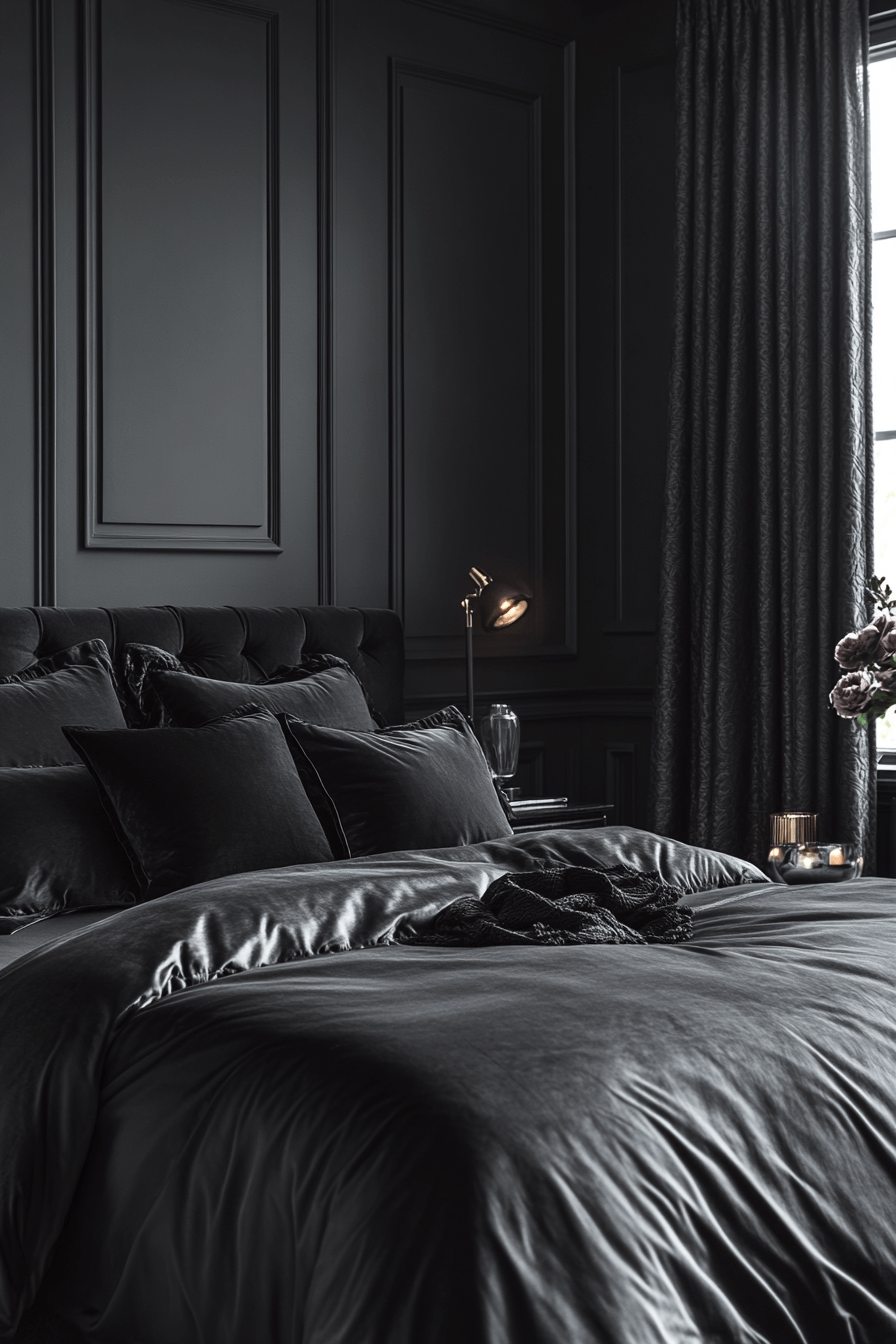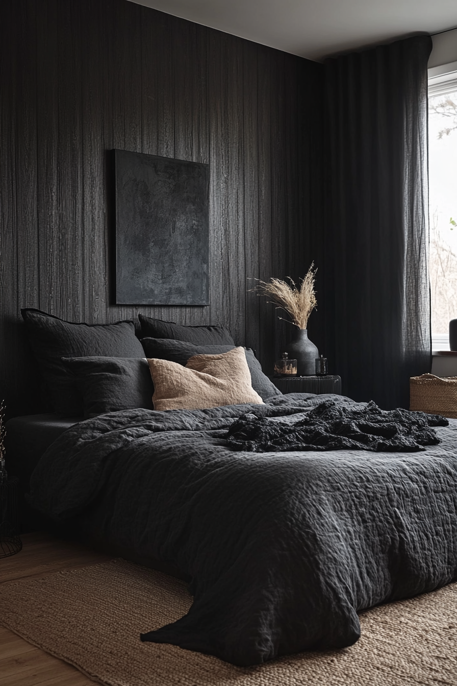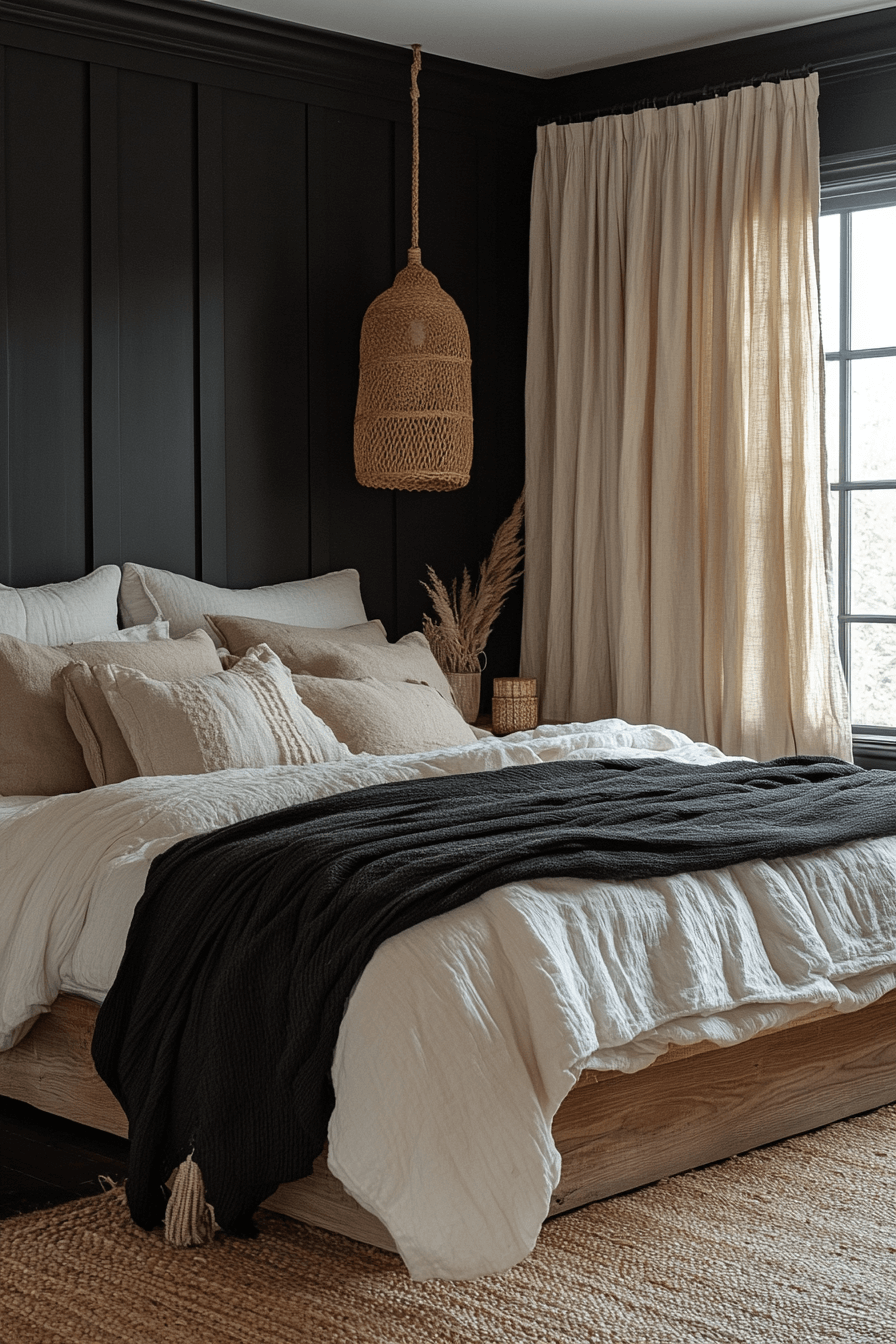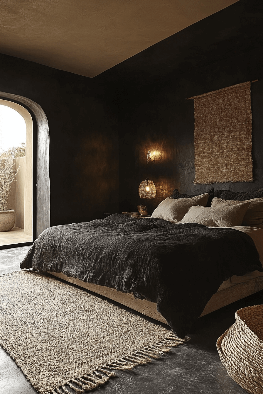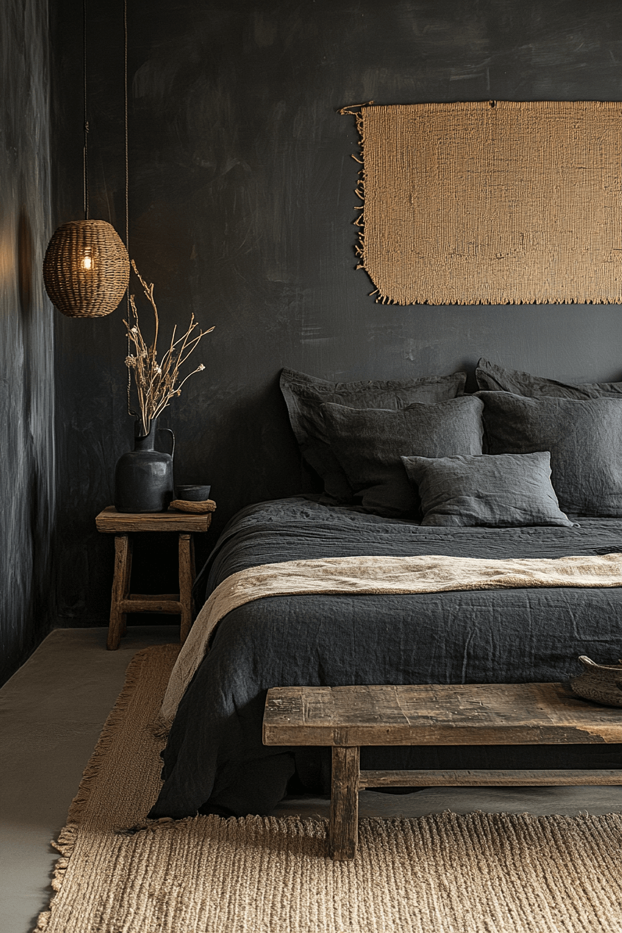Bold black hues meet soft, layered fabrics to craft a striking dark boho bedroom that feels both grounded and dramatic. Rich textures keep the atmosphere warm, while sleek furniture adds a contemporary edge. Charcoal bedding pairs beautifully with deep wood tones for visual depth. This design balances boldness with cozy charm.