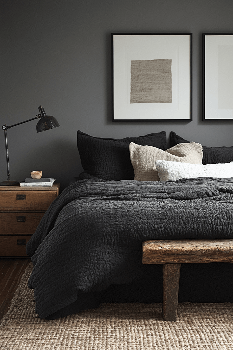 Matte black walls and sculptural furniture give this moody bedroom a curated, relaxed edge. Handcrafted pieces add artistry and depth. Soft gray bedding provides a light counterpoint to the dark backdrop. The result is dramatic but livable. Perfect for adding a dose of noir-inspired elegance to your home.