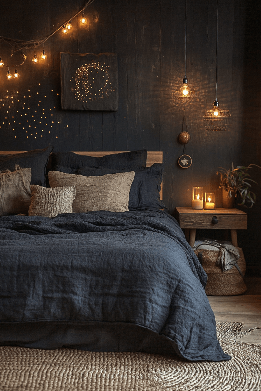 Slate bedding and artistic lighting make this dark boho bedroom playful yet refined. Unique wall sconces and statement lamps elevate the atmosphere. The deep hues are grounded by layered, tactile fabrics that invite you to linger. Pops of color in art and textiles add surprise without overwhelming the palette. It’s artistic, unapologetically bold, and perfect for free-spirited decorators.