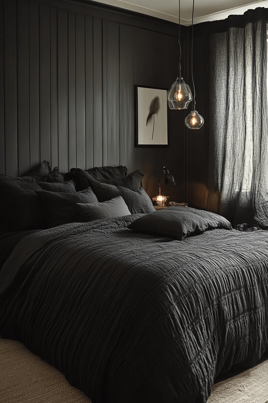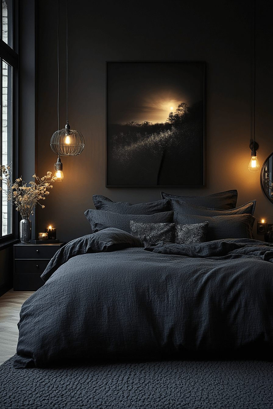 Jet black walls meet plush throws and low lighting for a space that feels both cozy and striking. A minimalist bed frame and art selection keep the mood fresh and uncluttered. The dark layers create depth and intimacy, ideal for restful nights. Every detail feels deliberate yet effortless. This is depth and comfort in perfect balance.