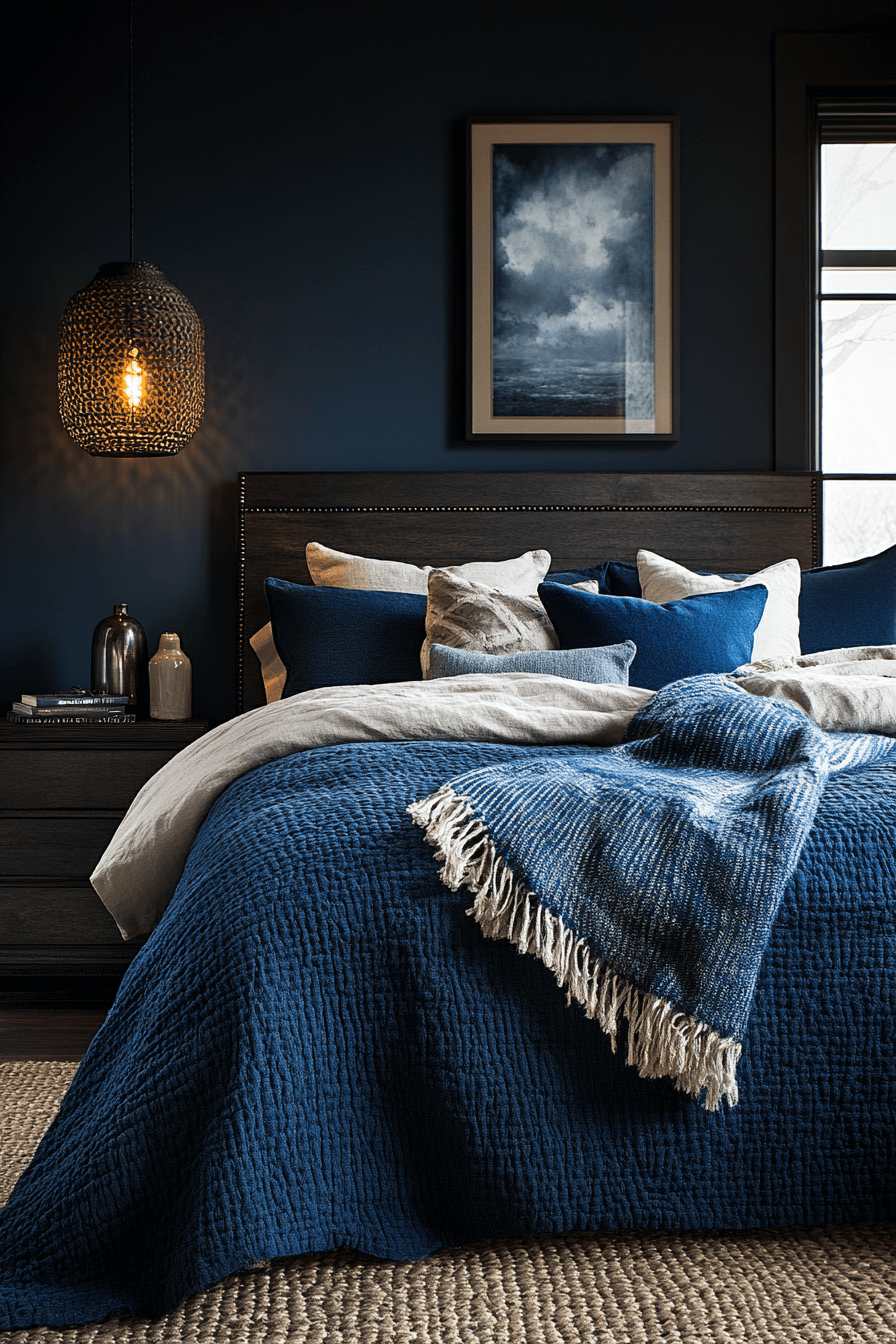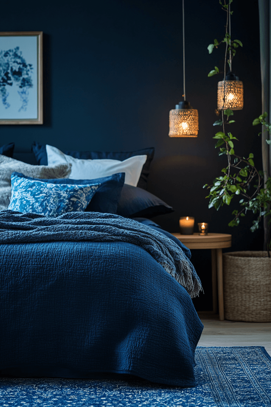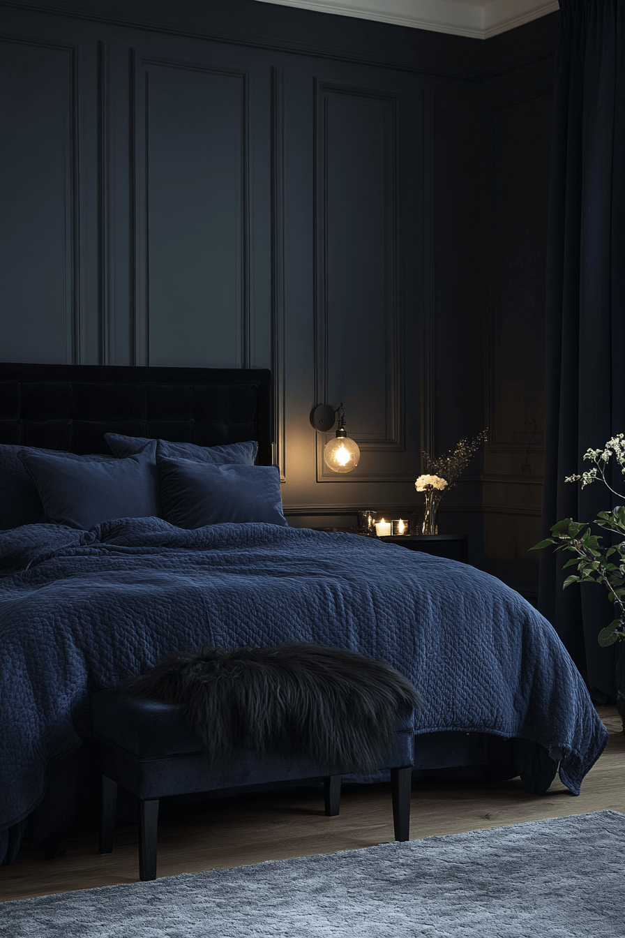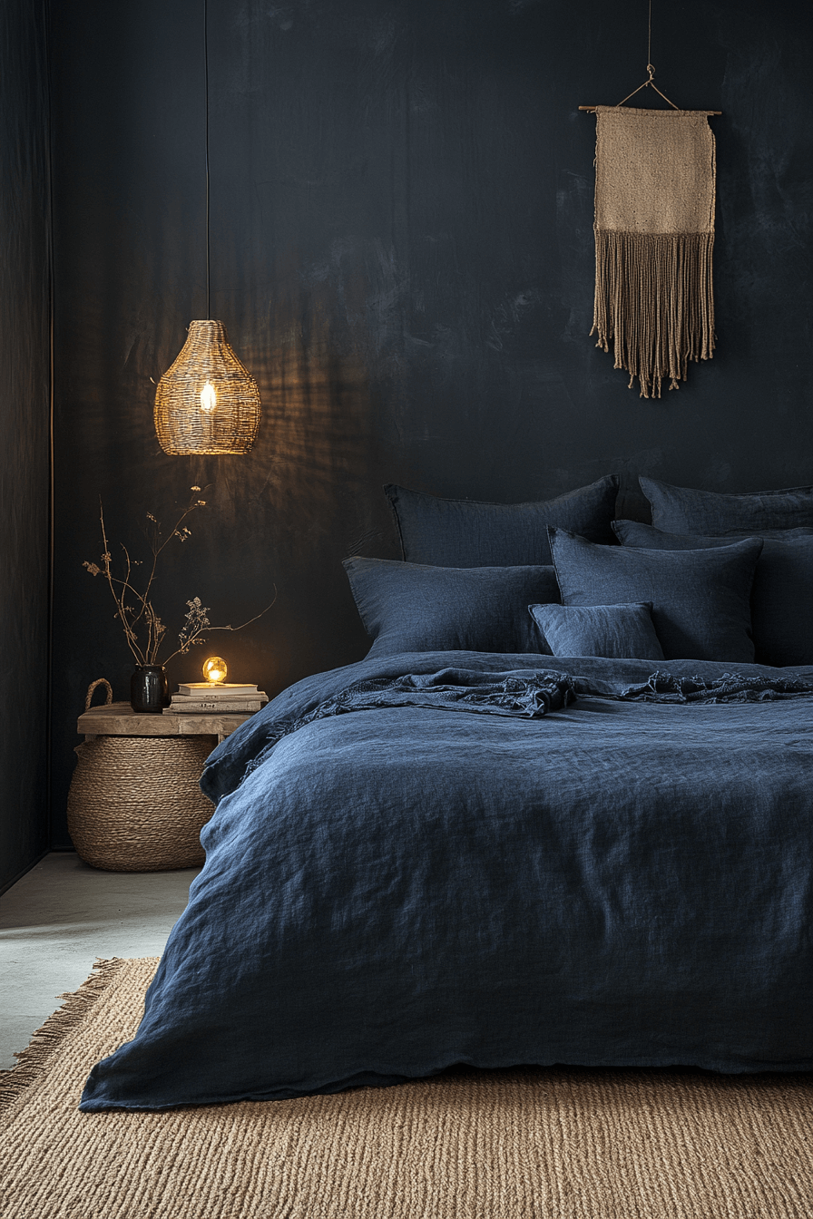 Deep navy and black tones create a serene, minimalist retreat. Simple geometric furniture pairs beautifully with soft, draped bedding for a balanced feel. The pared-down approach draws attention to texture and shadow. This is a room designed for deep thinking, slow mornings, and creative flow. It’s introspective yet stylish.