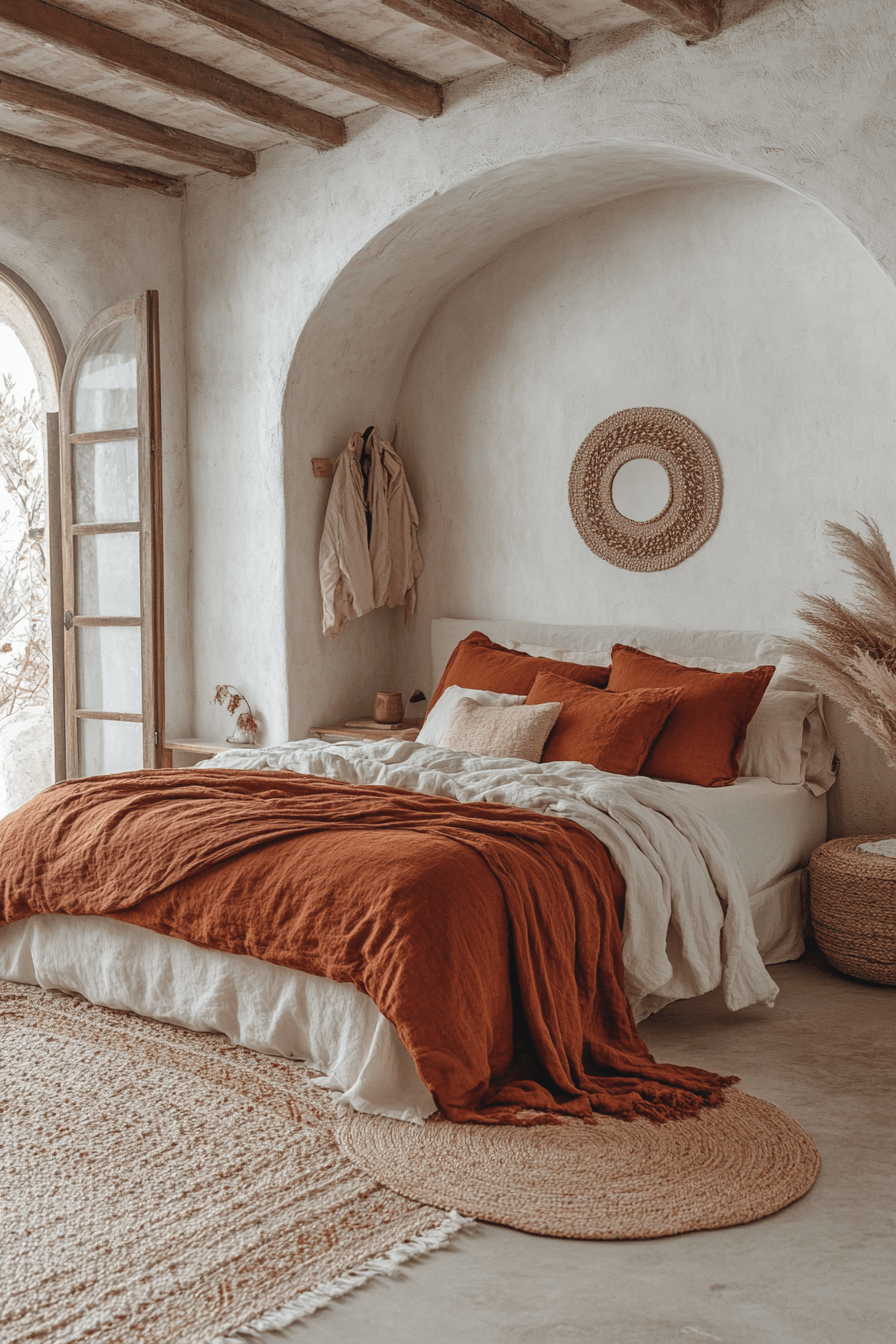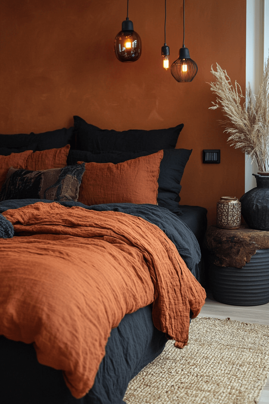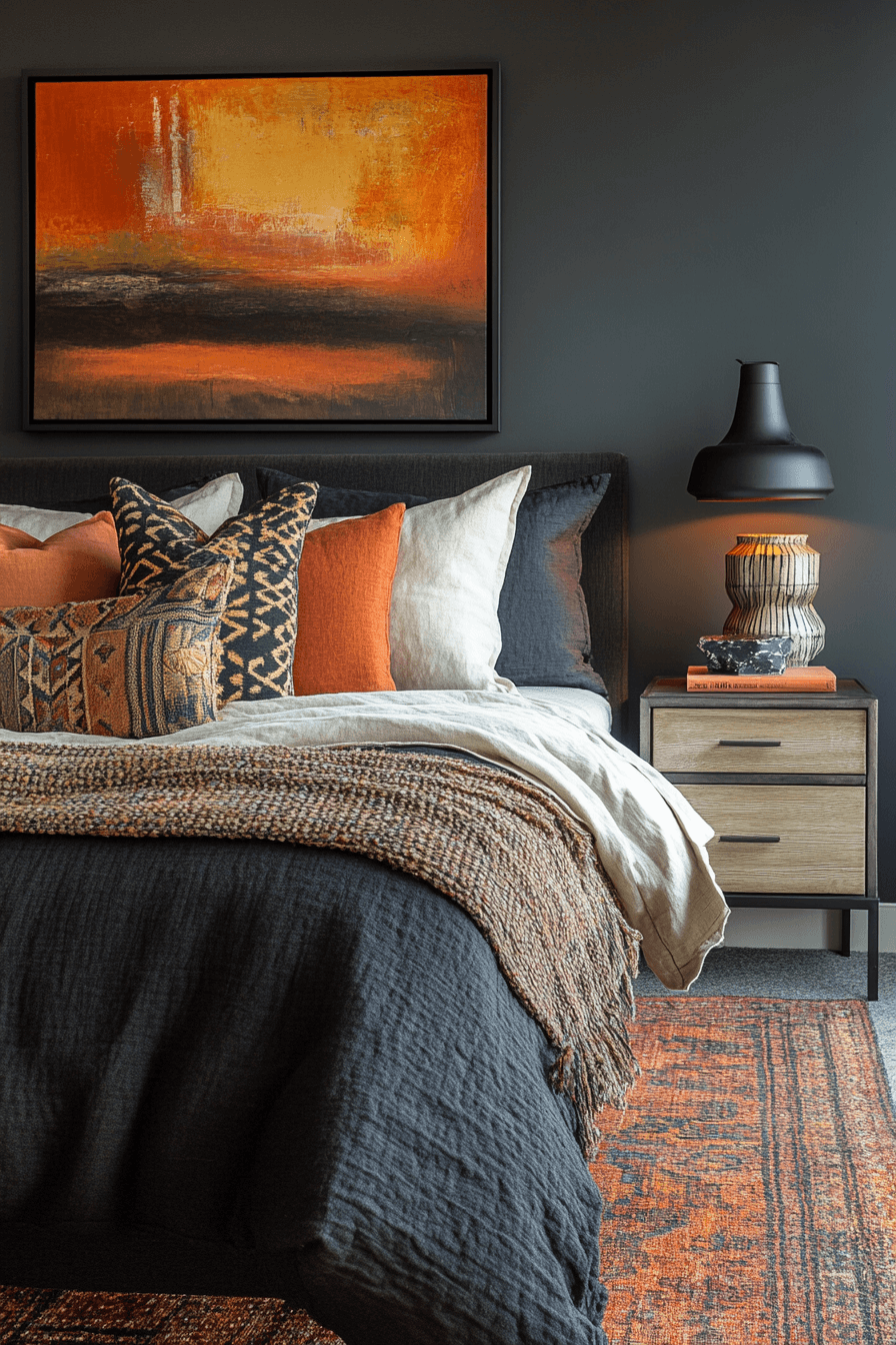 Fiery orange meets cool stone tones for a balanced, earthy aesthetic. Sculptural vases and organic art pieces create points of interest. The blend of warmth and coolness feels harmonious yet bold. Cozy layered bedding invites rest while the dramatic palette adds personality. Great for decorators who love contrast without chaos.