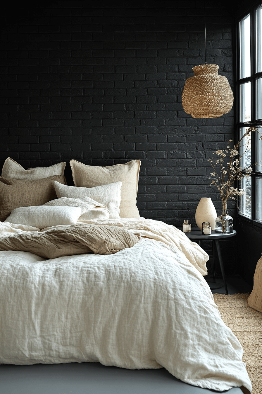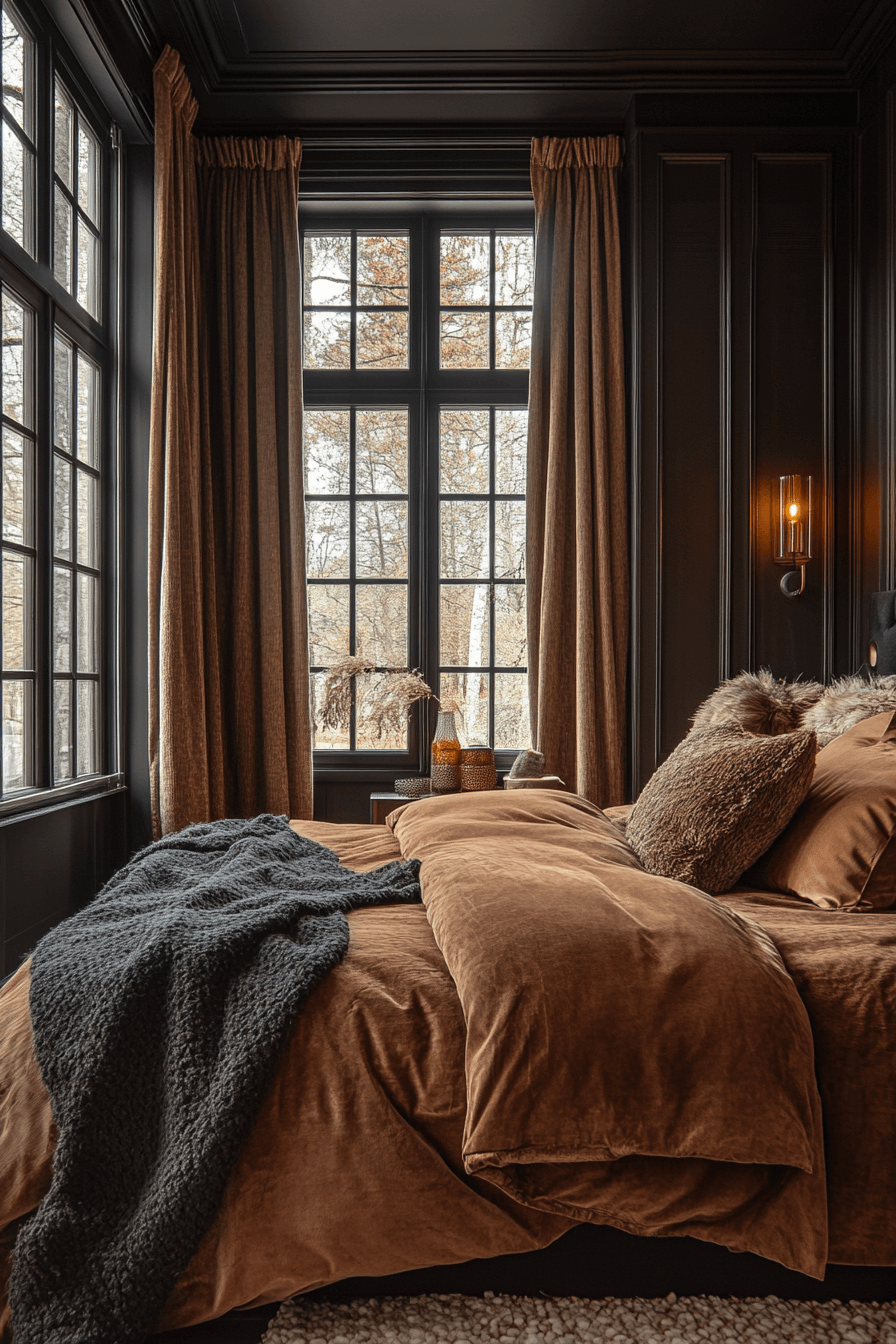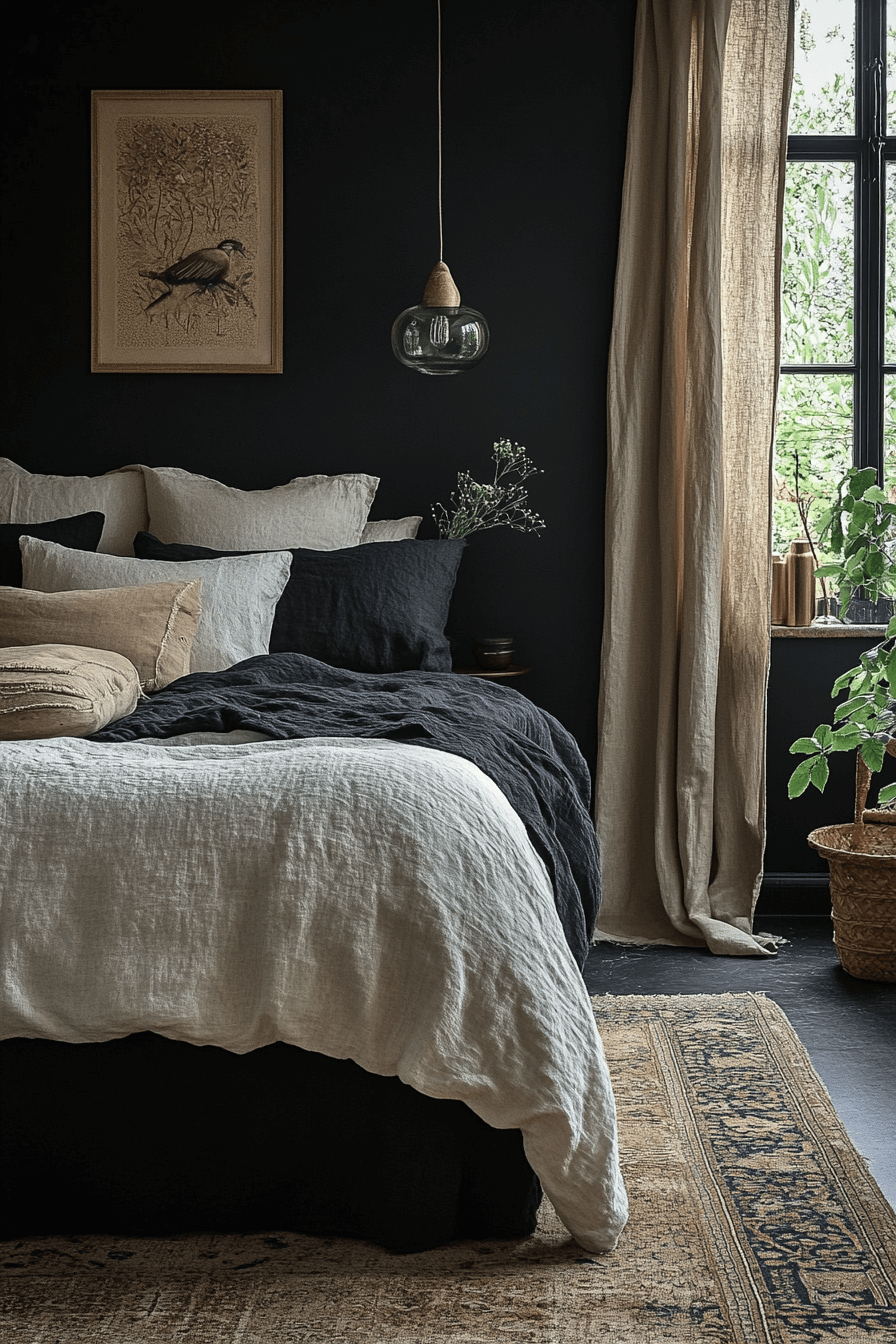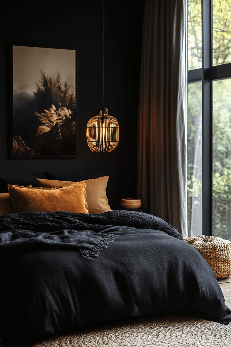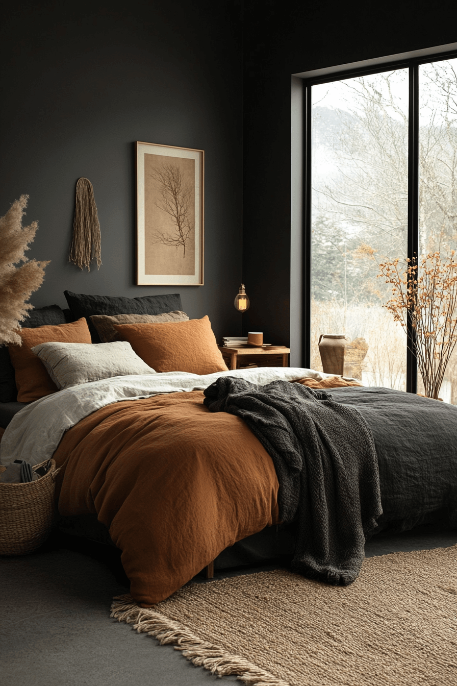 Deep black with caramel and chestnut accents creates a rich, warm dark boho bedroom. Plush fabrics and layered lighting enhance the cozy factor. The interplay between darkness and warmth feels luxurious. This palette is bold yet inviting, perfect for chilly evenings. Great for those who love sophisticated comfort.