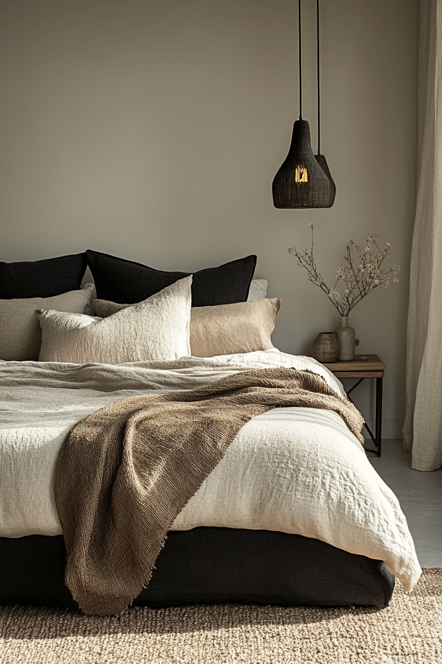 Black and warm neutrals combine for a sleek, modern dark boho bedroom. Architectural furniture shapes create visual interest without overwhelming. Soft cushions and layered throws balance the structure. The look is grounded, stylish, and perfectly moody. Ideal for clean-line enthusiasts.