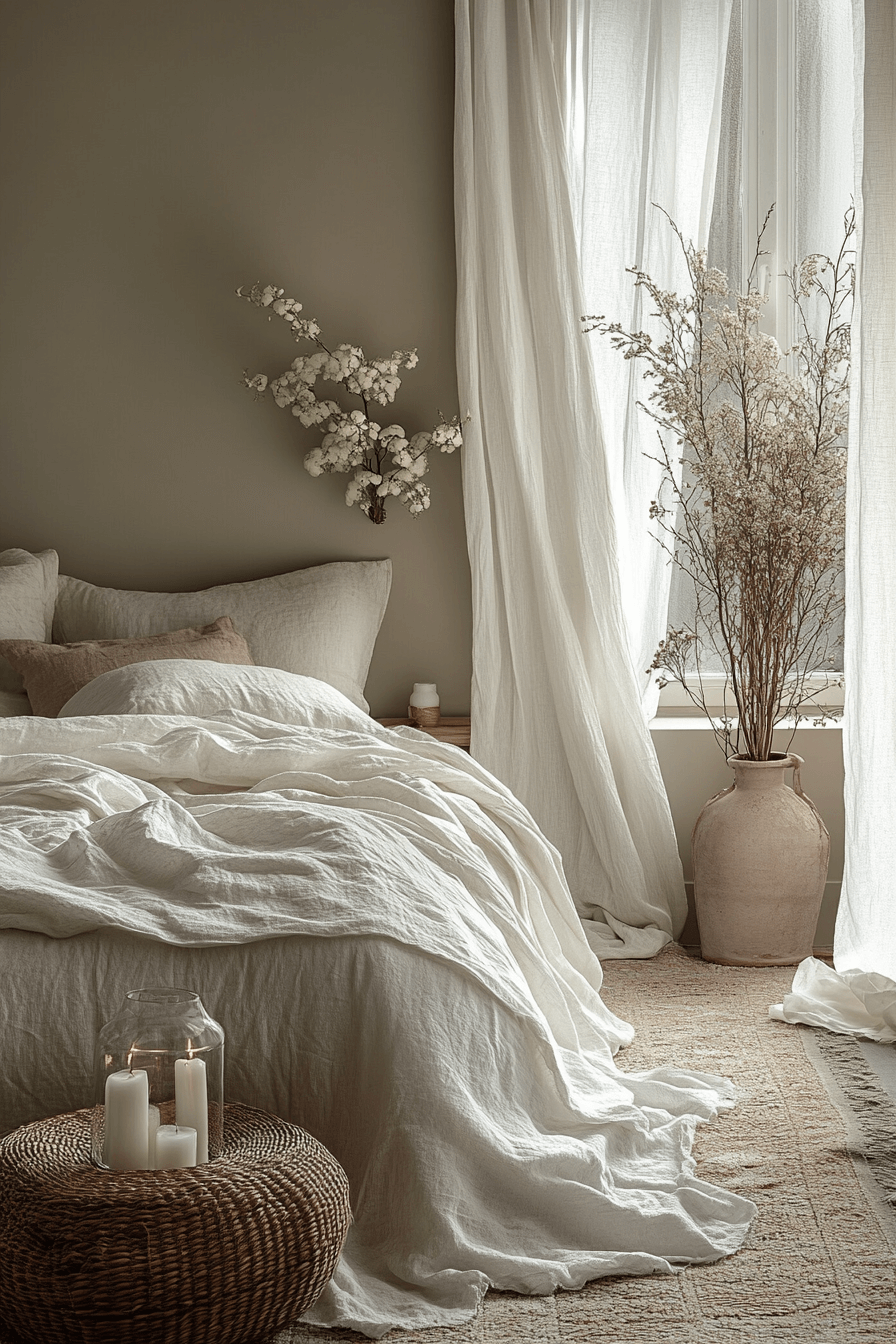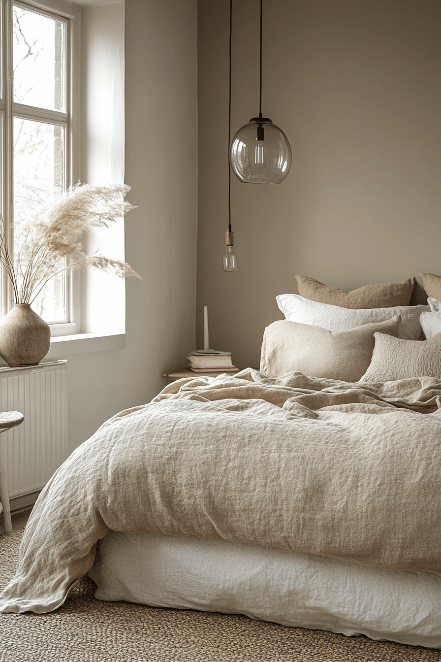 Soft gray and taupe create a gentle backdrop for this moody yet airy bedroom. Minimal furniture ensures the focus stays on tactile fabrics and warm lighting. Candlelight-inspired sconces and lamps add a soft, romantic glow. The lighter palette keeps the look approachable while still feeling atmospheric. It’s a softer take on moody design that feels both fresh and timeless.