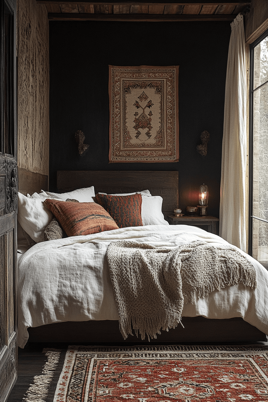Travel-inspired accents and rich, shadowy hues create a warm, collected feel in this dark boho bedroom. Layered rugs and sculptural furniture add character without overwhelming the space. Black, rust, and smoky gray bring a grounded yet adventurous atmosphere. This look suits the free-spirited soul.