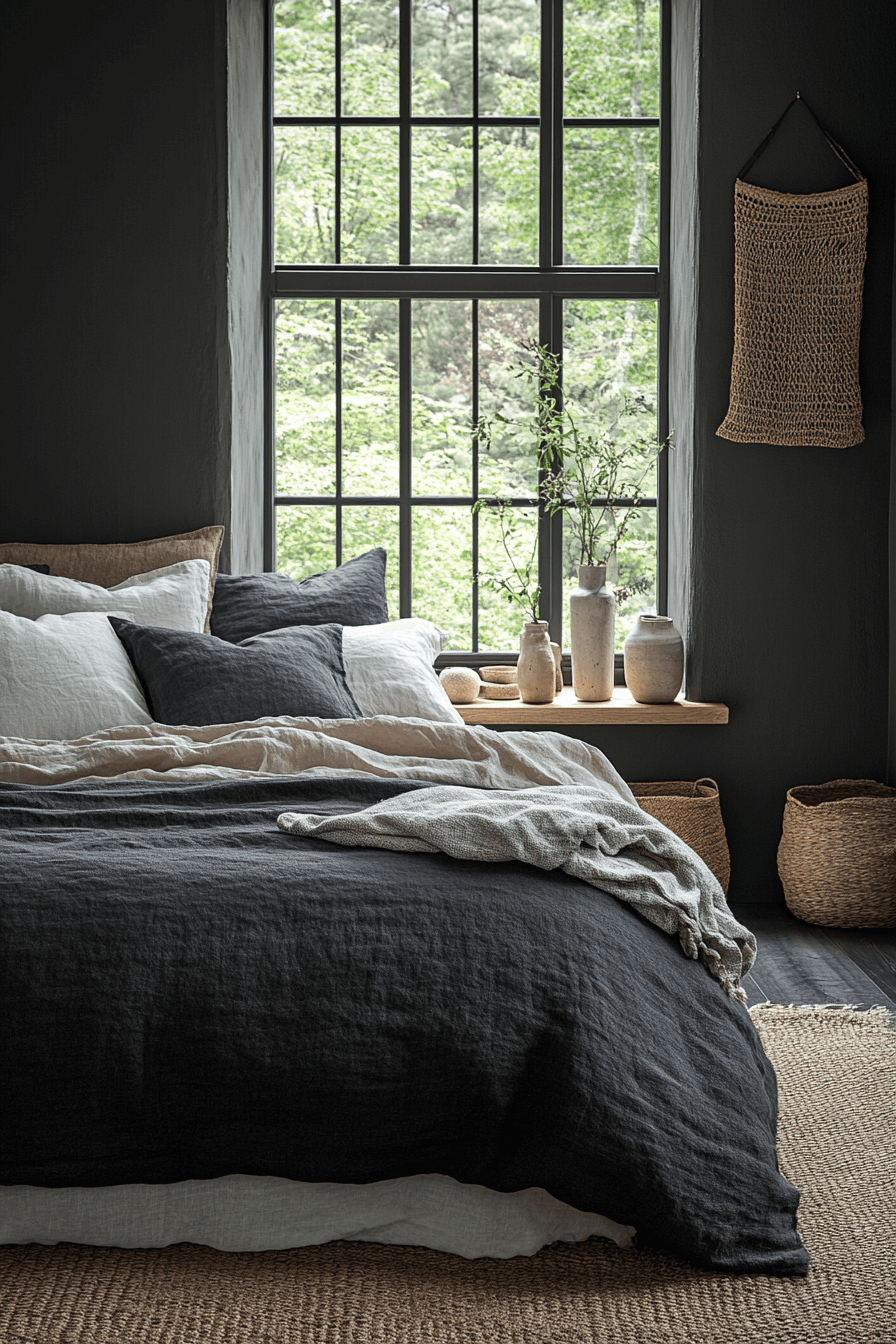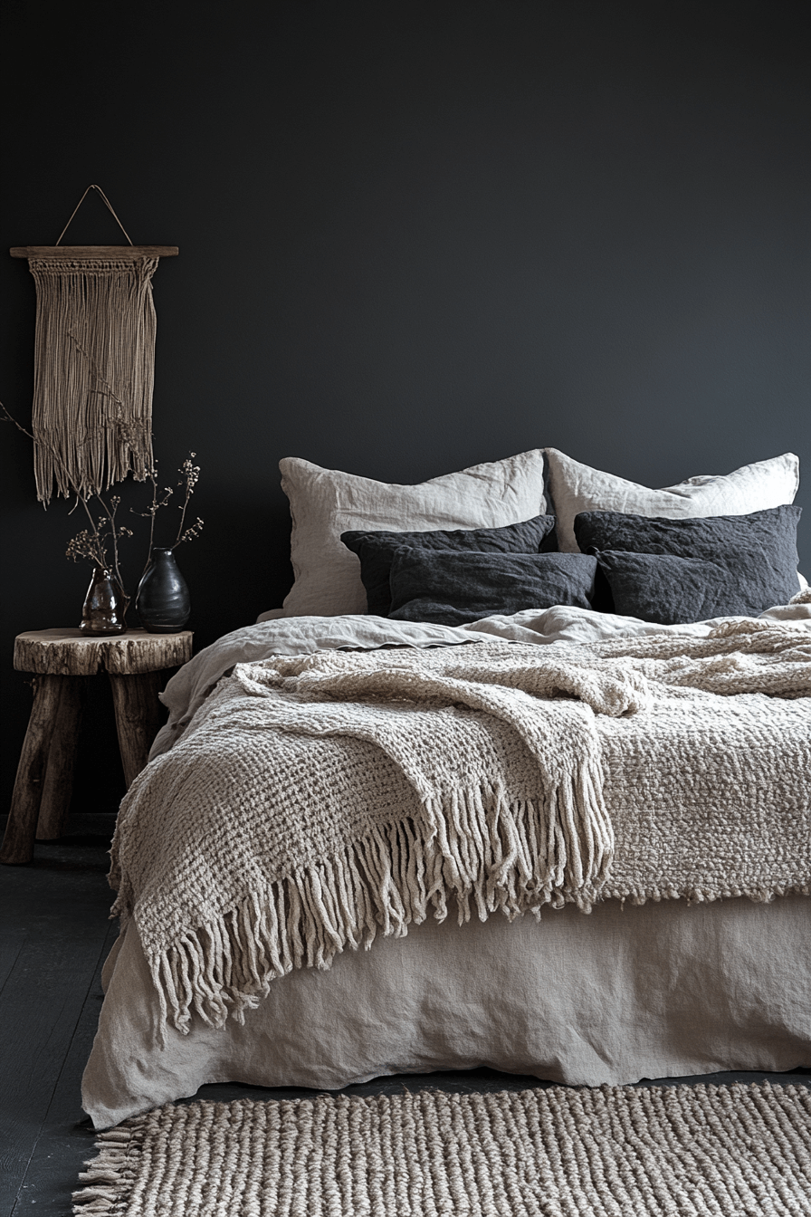 Deep gray walls and plush bedding make this dark boho bedroom feel both grounded and luxurious. Oversized throws and natural cotton sheets layer comfort into the design. A limited color scheme allows texture and form to shine. The result is simple but rich with visual appeal. Perfect for laid-back elegance and restful nights.