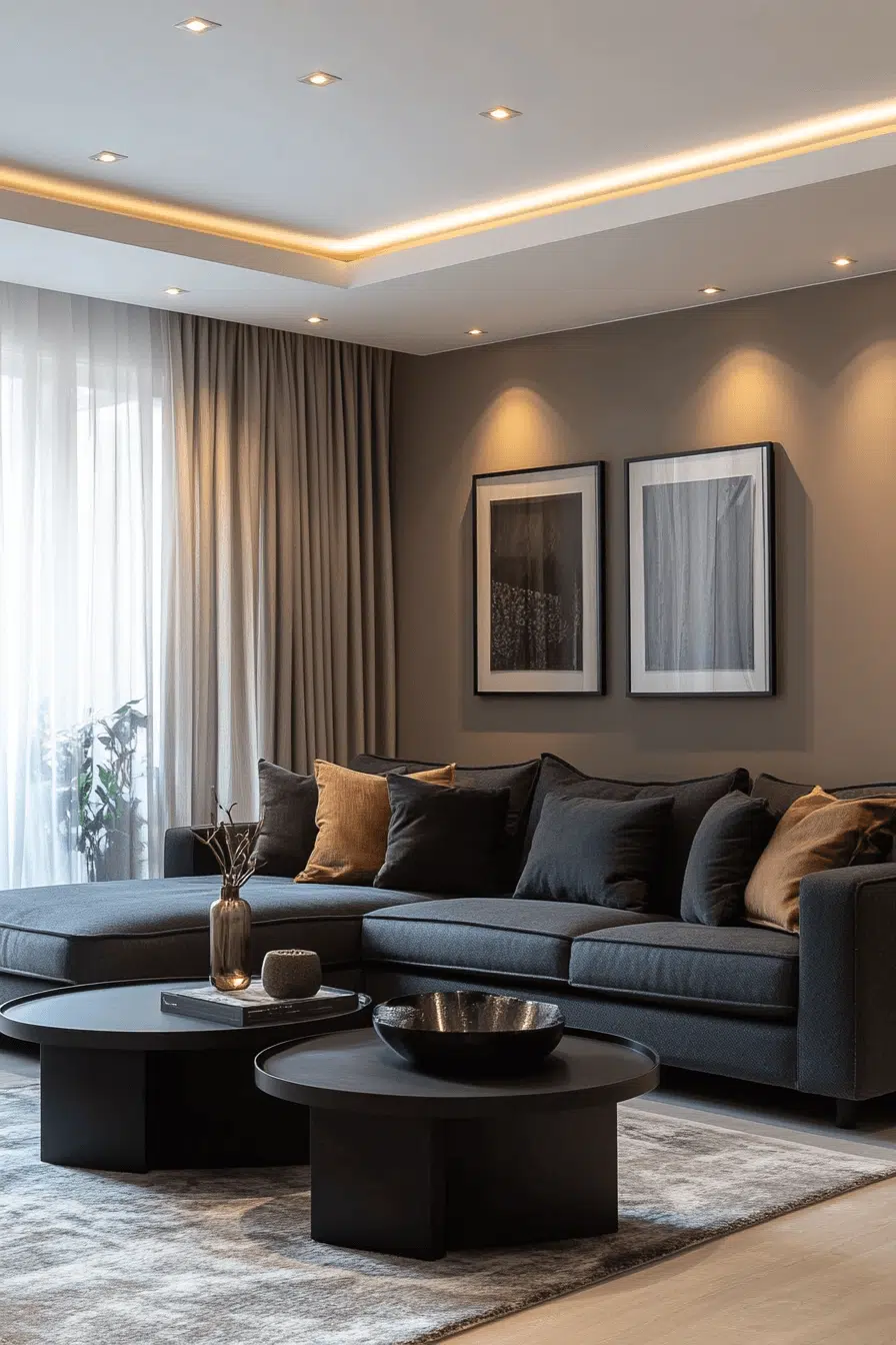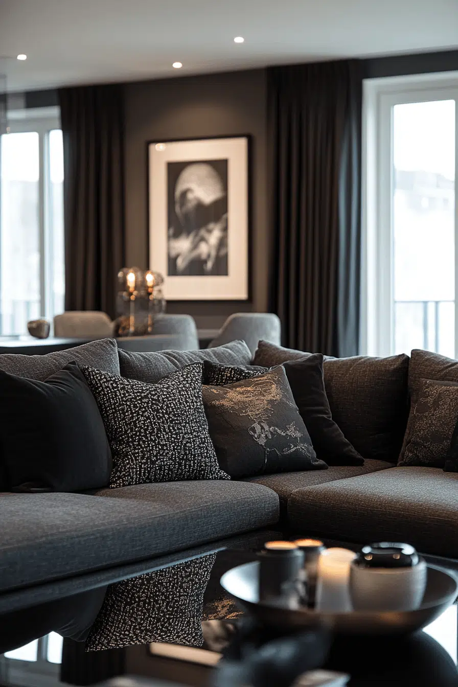 Strong visual contrast defines a dark grey sofa living room designed for impact. Light backdrops intensify the sofa’s depth. Strategic pops of color create focal points. Bold lighting enhances dimension. The space feels dynamic and modern.