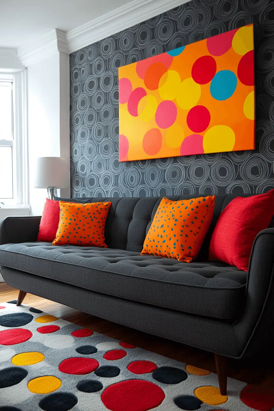 Creative expression thrives in a dark grey sofa living room designed with bold personality. Bright art and statement decor energize the neutral seating. Sculptural lighting introduces movement. The sofa keeps the space visually grounded. Every element feels intentional and expressive.