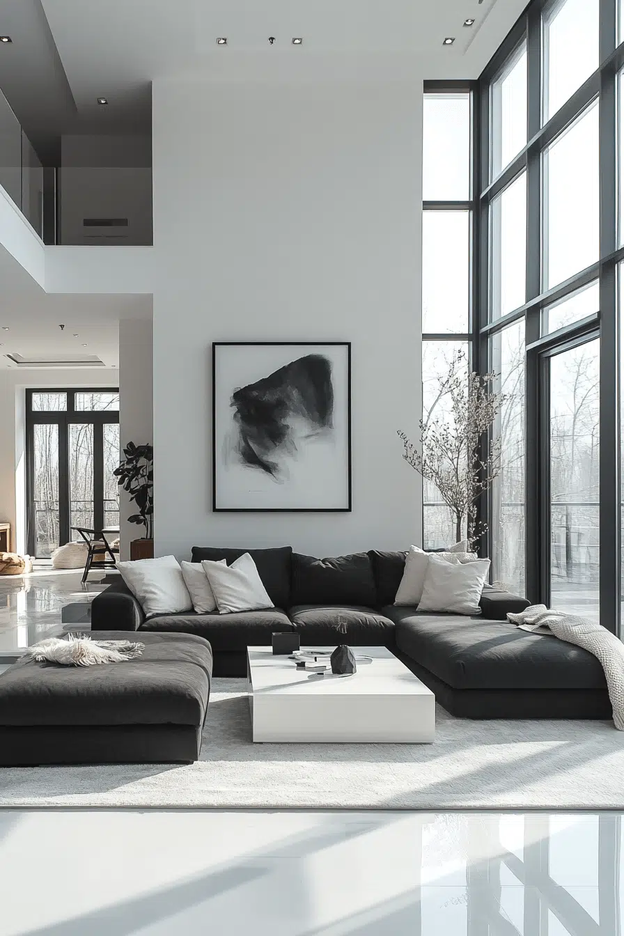 Sharp lines define a contemporary dark grey sofa living room with editorial presence. Crisp contrasts heighten drama. Minimal furnishings reinforce structure. The sofa leads the visual hierarchy. The look feels confident and bold.