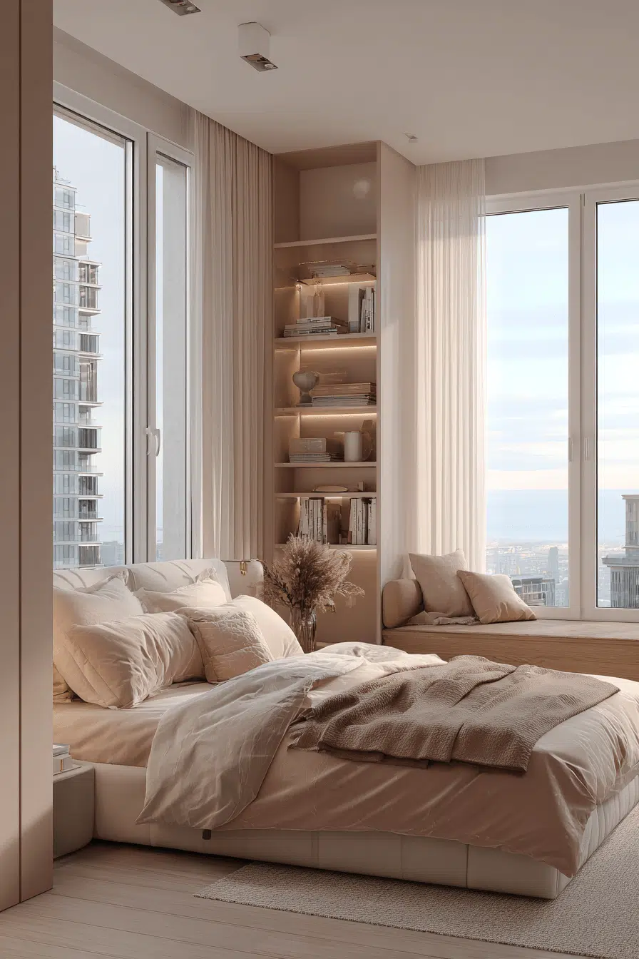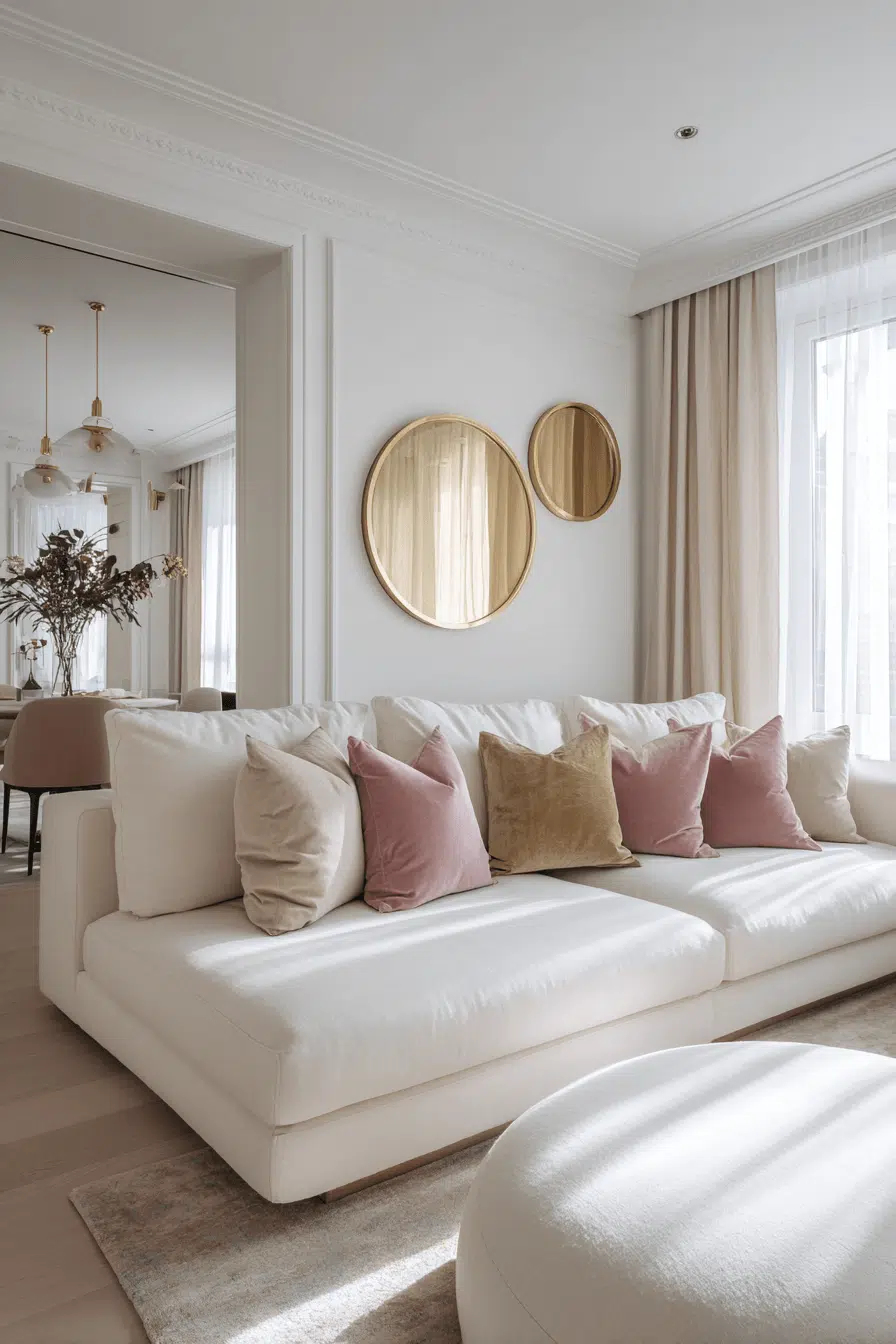 Blush accents integrated into architectural details can subtly transform a feminine apartment into something uniquely refined. Soft rose tones in trims, frames, or fixtures add personality while keeping the overall palette calm and balanced. Creamy and beige backgrounds allow these delicate touches to stand out beautifully. Clean lines and soft furnishings maintain a relaxed, effortless atmosphere throughout the space. The result is understated elegance with a personal, thoughtful touch. It’s a simple yet impactful way to elevate your interior design. Explore more feminine apartment ideas and add subtle charm to every corner of your home.