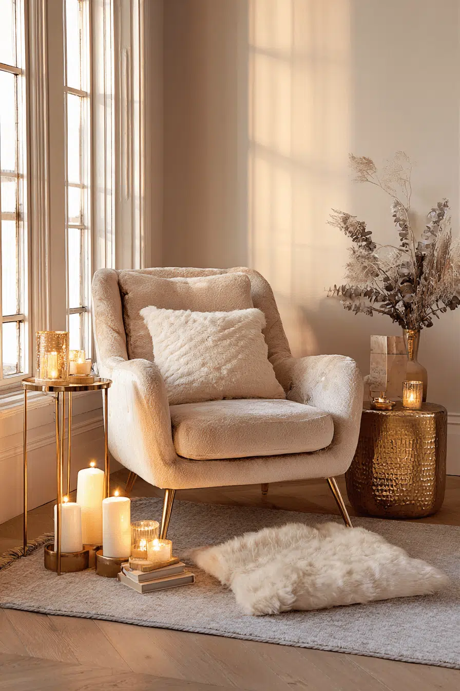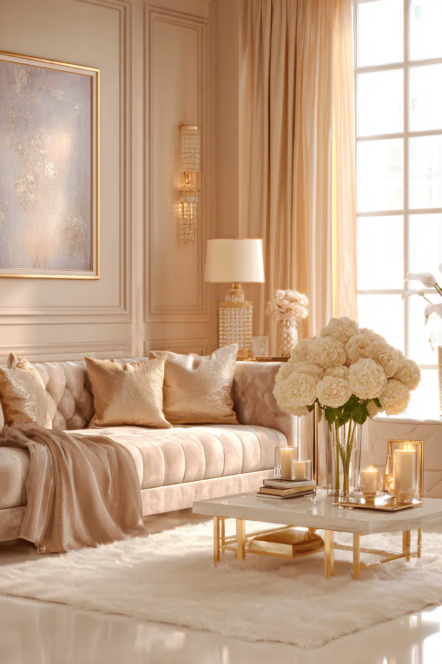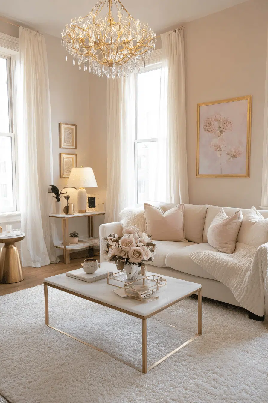 A feminine apartment feels elevated and luxurious when warm champagne tones are introduced throughout the design. Soft satin fabrics and plush rugs enhance the sense of comfort while adding subtle richness. Gold accents and warm lighting create a gentle glow that instantly makes the space feel more refined. Blush and ivory elements blend seamlessly into the palette for a polished, cohesive look. The combination of softness and elegance results in a space that feels both cozy and sophisticated. It’s a perfect balance of glamour and livability. Explore more feminine apartment ideas and bring this radiant style into your home.