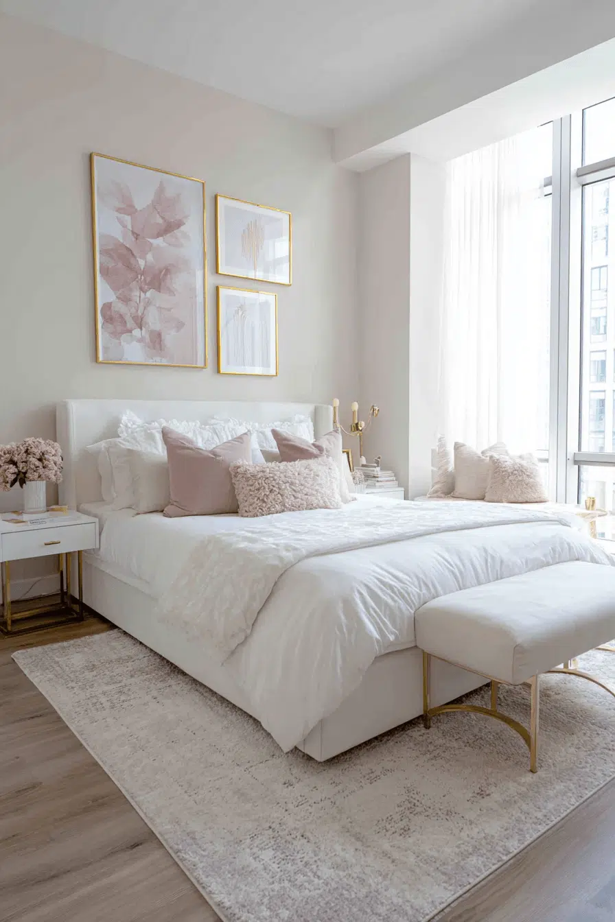Layered whites with soft gold accents can make a feminine apartment feel bright, elegant, and luxurious. Matte and glossy finishes combine to create subtle depth and texture. Soft furnishings keep the atmosphere warm and inviting while maintaining a refined aesthetic. The light palette enhances openness and airiness throughout the space. It’s a clean, polished style that feels both modern and timeless. Discover more feminine apartment ideas and bring luminous elegance into your home.
