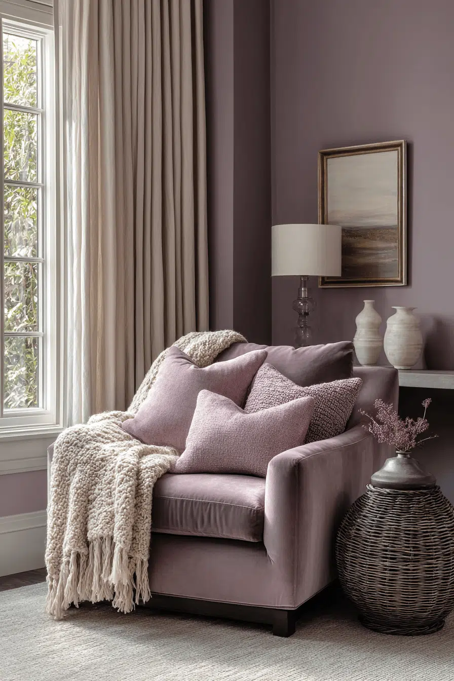 Muted mauve shades bring a rich yet calming depth to a feminine apartment that feels both cozy and refined. Paired with soft creams and neutral tones, the palette creates a soothing visual flow. Layered textiles enhance comfort while adding subtle visual interest throughout the space. Natural light amplifies the beauty of these tones, making the room feel warm and inviting. The result is a perfectly balanced interior that feels serene and stylish. It’s an elegant way to introduce color without overwhelming the design. Explore more feminine apartment ideas and create a softly sophisticated home.