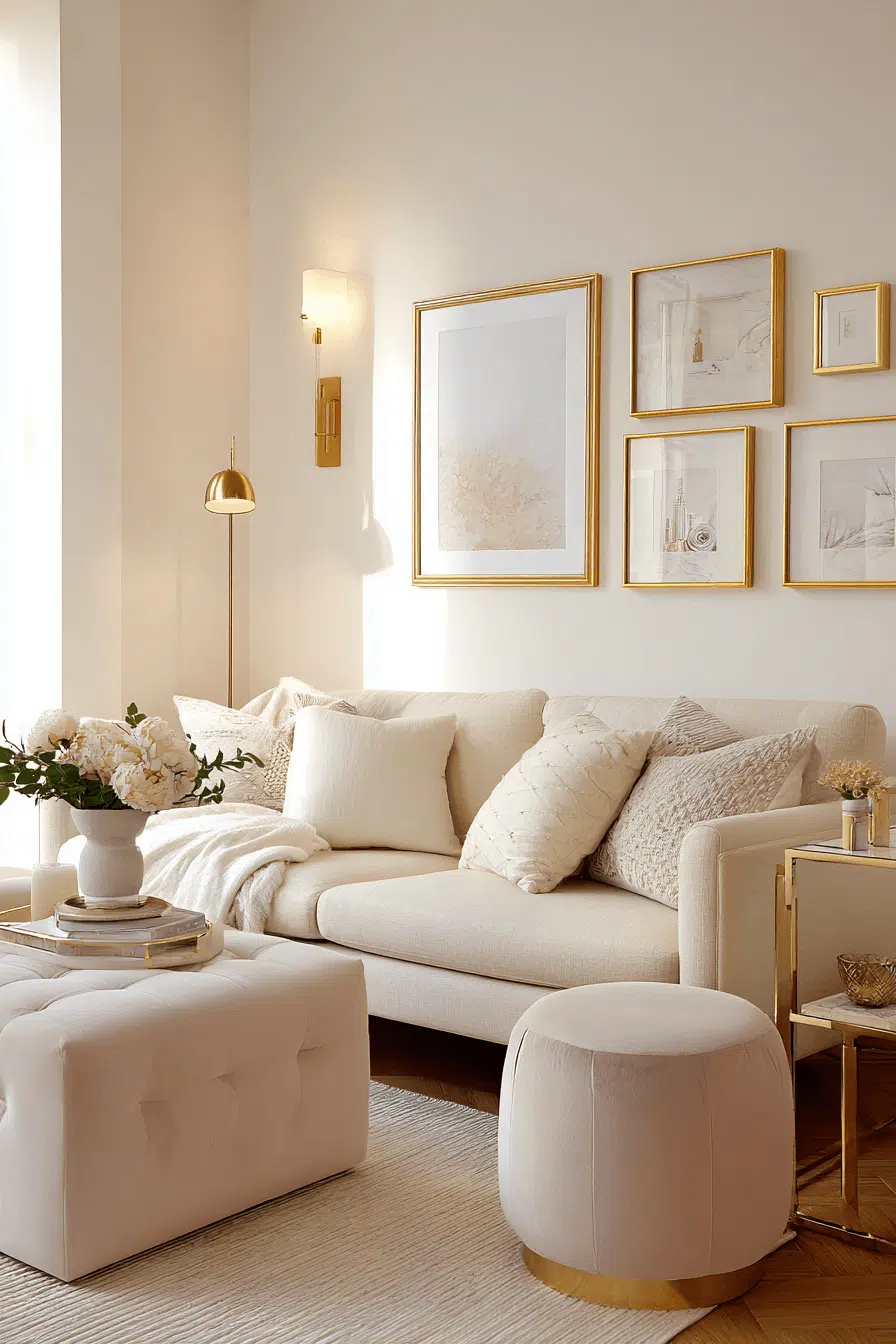 A feminine apartment feels brighter and more expansive when soft neutrals are paired with warm, glowing accents. Gentle lighting highlights architectural details and creates a welcoming, airy atmosphere. Gold-framed mirrors and reflective decor help bounce light around the room. Soft furnishings maintain comfort while keeping the aesthetic clean and minimal. The result is a luminous, open space that feels both cozy and refined. It’s a simple yet powerful way to enhance any interior. Discover more feminine apartment ideas and bring light-filled elegance into your home.