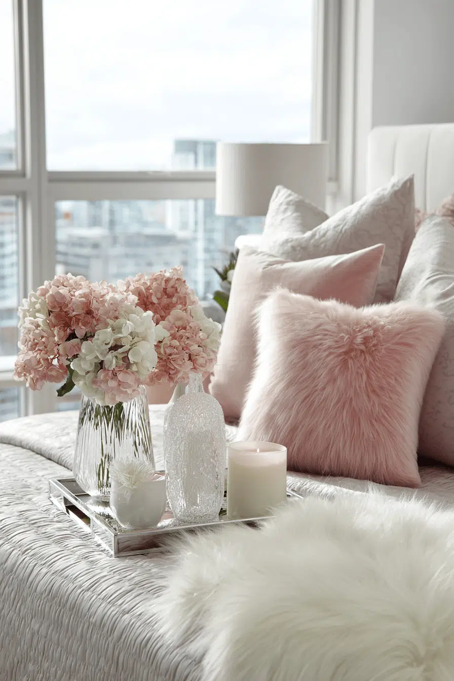 Cool, airy tones can refresh a feminine apartment with a modern yet comforting feel. Soft pinks, icy neutrals, and pale ivory shades create a crisp, open atmosphere. Layered textures like glass, faux fur, and brushed metals add dimension without heaviness. The palette keeps the space feeling light while still warm and inviting. It’s a fresh interpretation of soft feminine design. Every detail works together to maintain balance and clarity. Explore more feminine apartment ideas and achieve a clean, airy aesthetic.