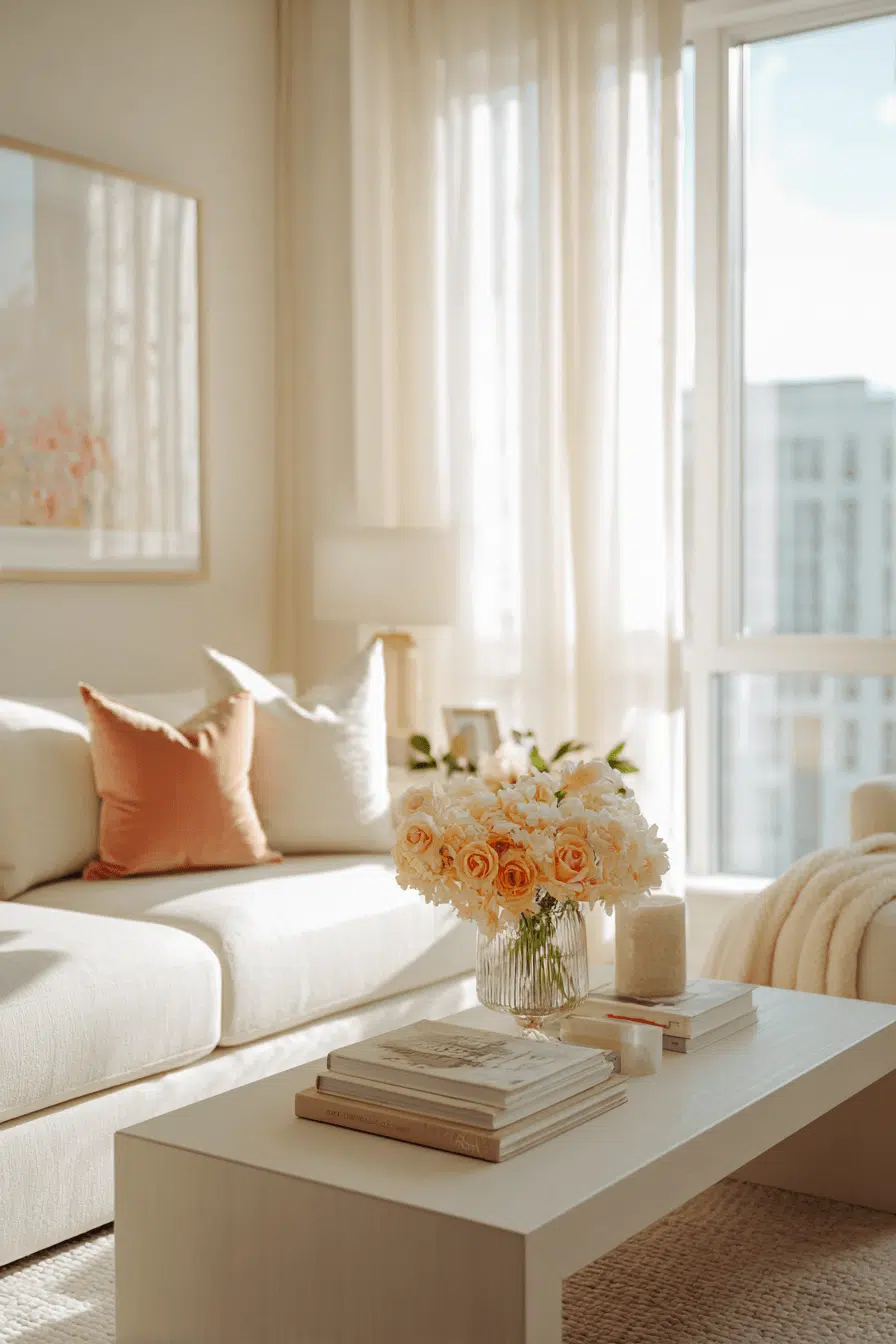 Soft cream tones can completely transform a feminine apartment into a serene, light-filled sanctuary. Ivory walls and pale wood finishes create a calm, elegant foundation throughout the space. Gentle blush accents add warmth while preserving the peaceful atmosphere. Natural light enhances every soft detail, making the room feel open and inviting. The overall effect is timeless, soothing, and effortlessly beautiful. It’s a perfect foundation for understated luxury. Discover more feminine apartment ideas and design a tranquil, cream-inspired home.