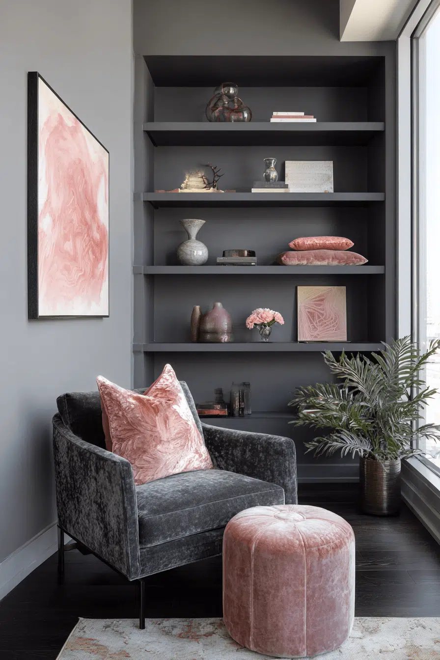A feminine apartment feels beautifully balanced when soft blush tones are paired with deeper gray accents. Slate and charcoal elements add structure and contrast, grounding the design. Gentle pink hues soften the palette and maintain warmth throughout the space. Textures and layered decor help blend the tones seamlessly. The result is a modern, sophisticated interior with emotional depth. It’s a perfect harmony of softness and strength. Explore more feminine apartment ideas and create a balanced, expressive home.