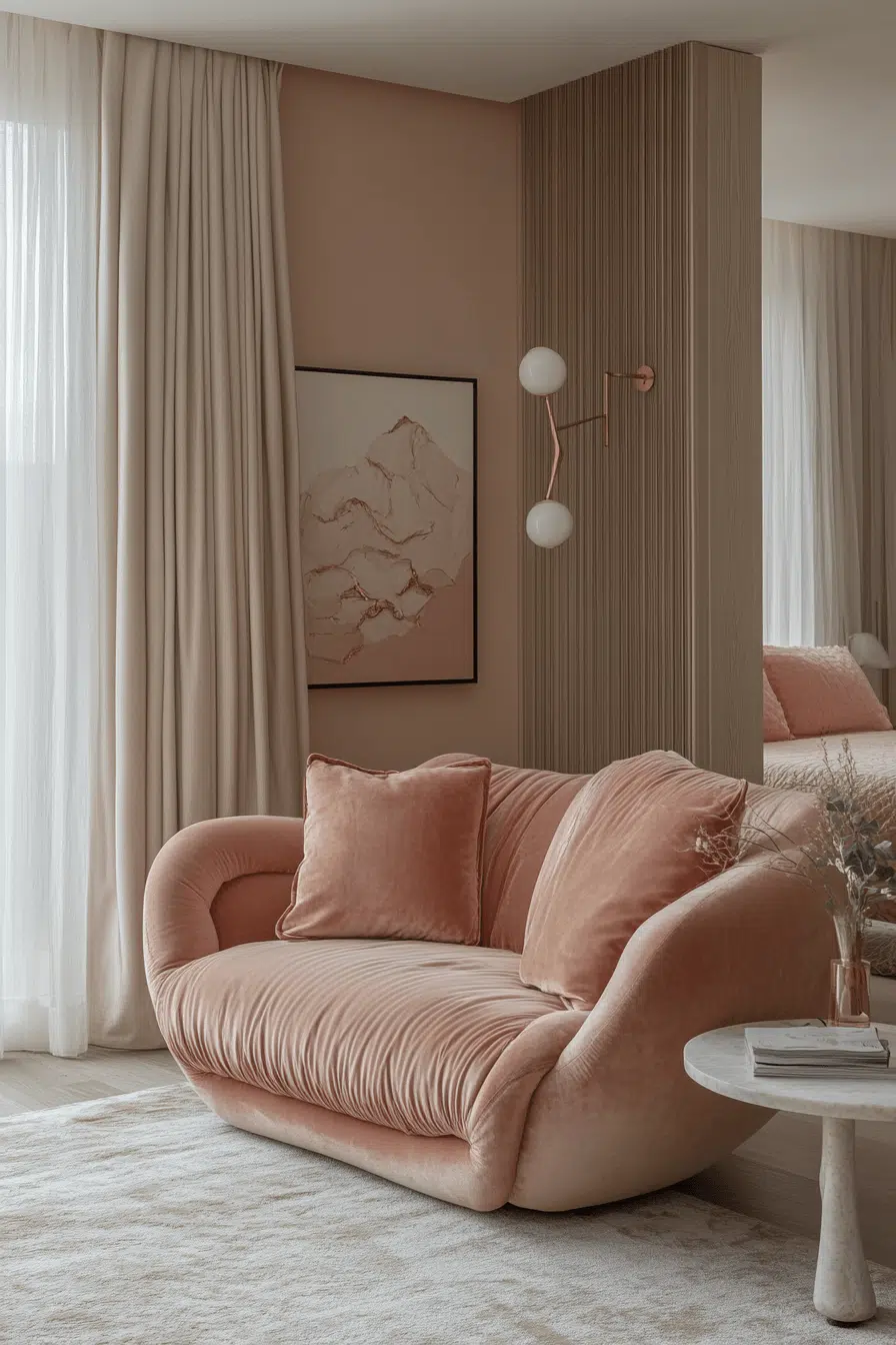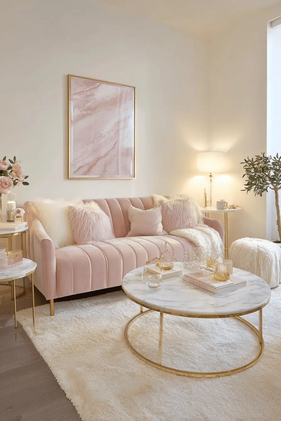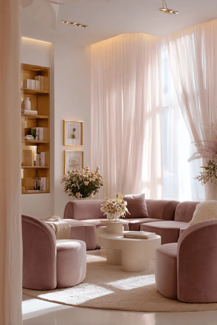 Soft blush hues combined with natural stone-inspired textures can instantly elevate a feminine apartment with warmth and quiet elegance. Curved furniture pieces help soften the layout, creating a gentle and inviting flow throughout the room. Light, airy finishes keep the atmosphere open and refreshing while allowing subtle pink accents to shine beautifully. Marble and quartz-inspired details introduce a polished, high-end feel that enhances the overall aesthetic. The balance of softness and structure creates a space that feels both stylish and comforting. It’s a perfect harmony of romance and sophistication that never feels overpowering. Explore more feminine apartment inspiration and bring this soft, elevated look into your home.