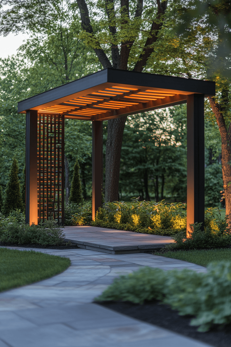 Sleek and refined, minimalist arches shine among modern garden arbor ideas with their clean and simple appeal. Dark finishes or metallic tones contrast beautifully with soft greenery. These streamlined structures offer durability while maintaining a light visual presence. They can stand alone or frame focal features within the landscape. The result feels effortlessly stylish. Uncover garden arbor ideas that embrace minimalist design.