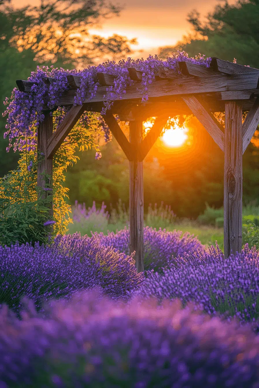 Soft scent and soothing tones define garden arbor ideas centered around lavender blooms. A simple structure allows the plants to flourish naturally. The gentle purple hues add elegance and calm. Placing it near seating enhances relaxation. The space feels serene and refreshing. Explore garden arbor ideas that inspire calm living.