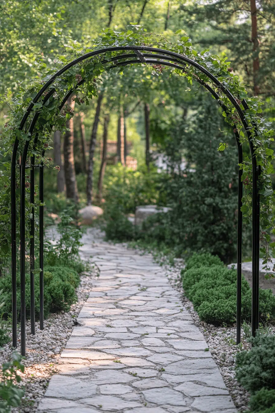 For a modern twist, steel-framed designs elevate traditional garden arbor ideas with a sleek, durable finish. Clean lines pair beautifully with climbing vines like jasmine or clematis. The reflective surface subtly brightens shaded corners of your yard. This low-maintenance option still delivers strong visual appeal. The combination feels both practical and stylish. Get inspired by garden arbor ideas with a contemporary edge.