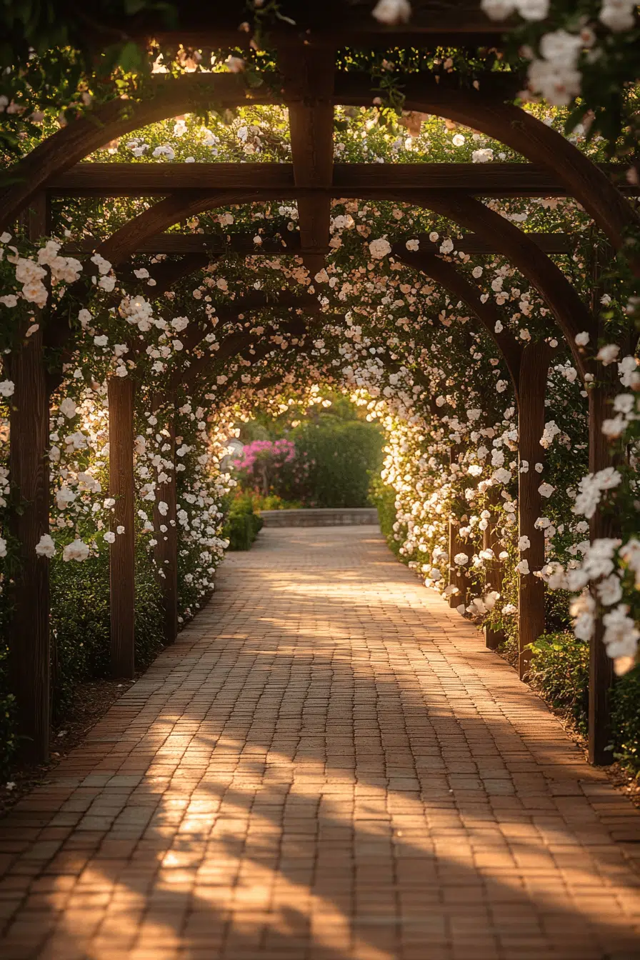 A tranquil pathway comes alive with garden arbor ideas featuring soft jasmine blooms. A simple structure becomes a fragrant tunnel as delicate flowers cascade overhead. The gentle scent creates a calming, spa-like atmosphere. The space feels peaceful and welcoming for quiet moments outdoors. It’s ideal for creating a relaxing retreat. Discover garden arbor ideas that enhance sensory beauty.