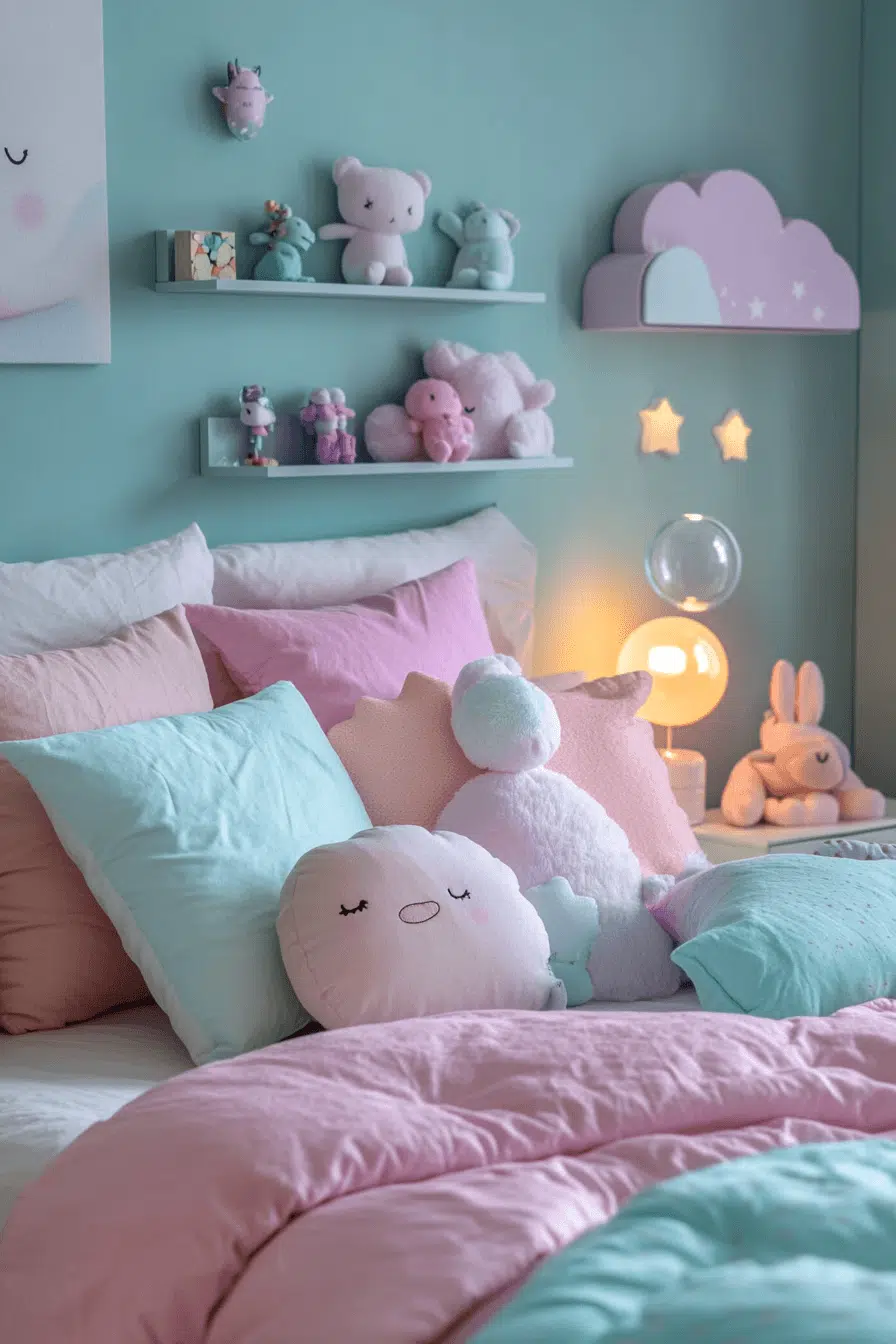 A pastel palette can bring playful energy into girlie room decor while maintaining a soft, cohesive look. Shades of pink, blue, mint, and lilac work together to create a cheerful environment. Modern touches like color-blocking keep the design fresh and stylish. Simple layouts prevent the space from feeling cluttered. The overall effect feels light, fun, and full of personality. Discover more girlie room decor ideas with pastel inspiration.