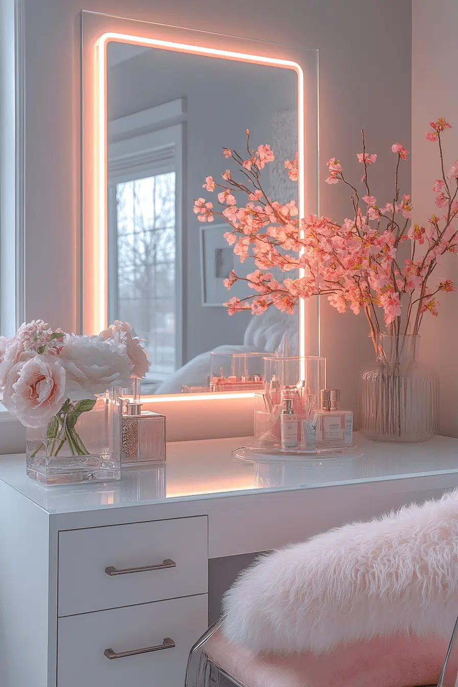 Layered lighting can completely redefine girlie room decor by creating depth and mood throughout the space. Soft LED strips, illuminated mirrors, and glowing accents add a radiant, modern feel. Pairing these elements with pale pink or crisp white tones keeps everything balanced and fresh. A well-lit vanity adds both functionality and style. The atmosphere feels bright, reflective, and full of personality. Discover more girlie room decor ideas that glow beautifully.