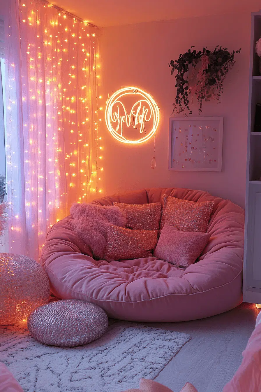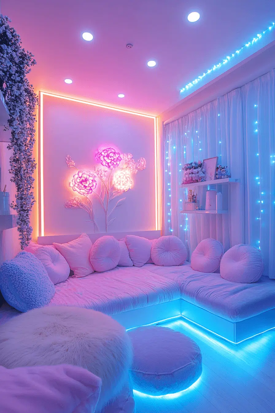 Colorful lighting can bring a playful twist to girlie room decor while adding personality. Soft LED hues create a gentle ombré effect across walls and decor. Whimsical accents like heart-shaped lamps enhance the fun vibe. Pastel accessories tie the whole look together. The room feels cheerful and unique. Explore more girlie room decor ideas with creative lighting.