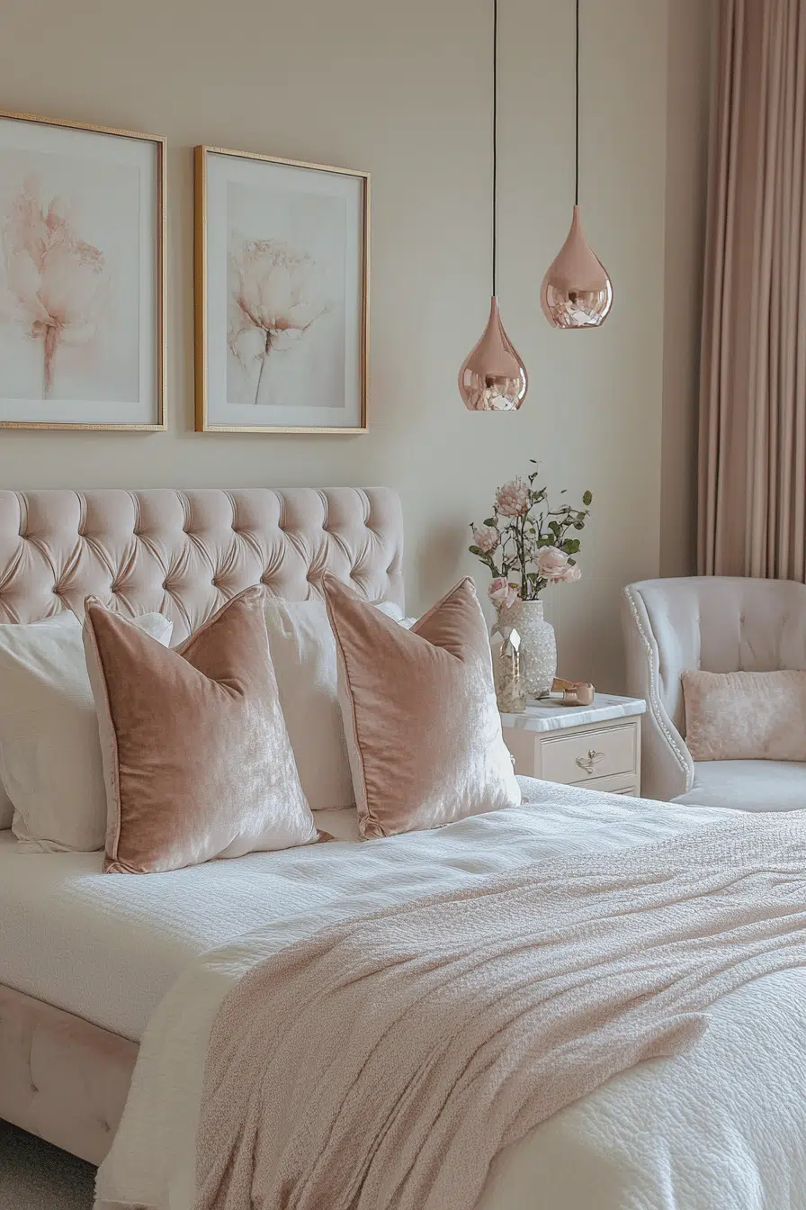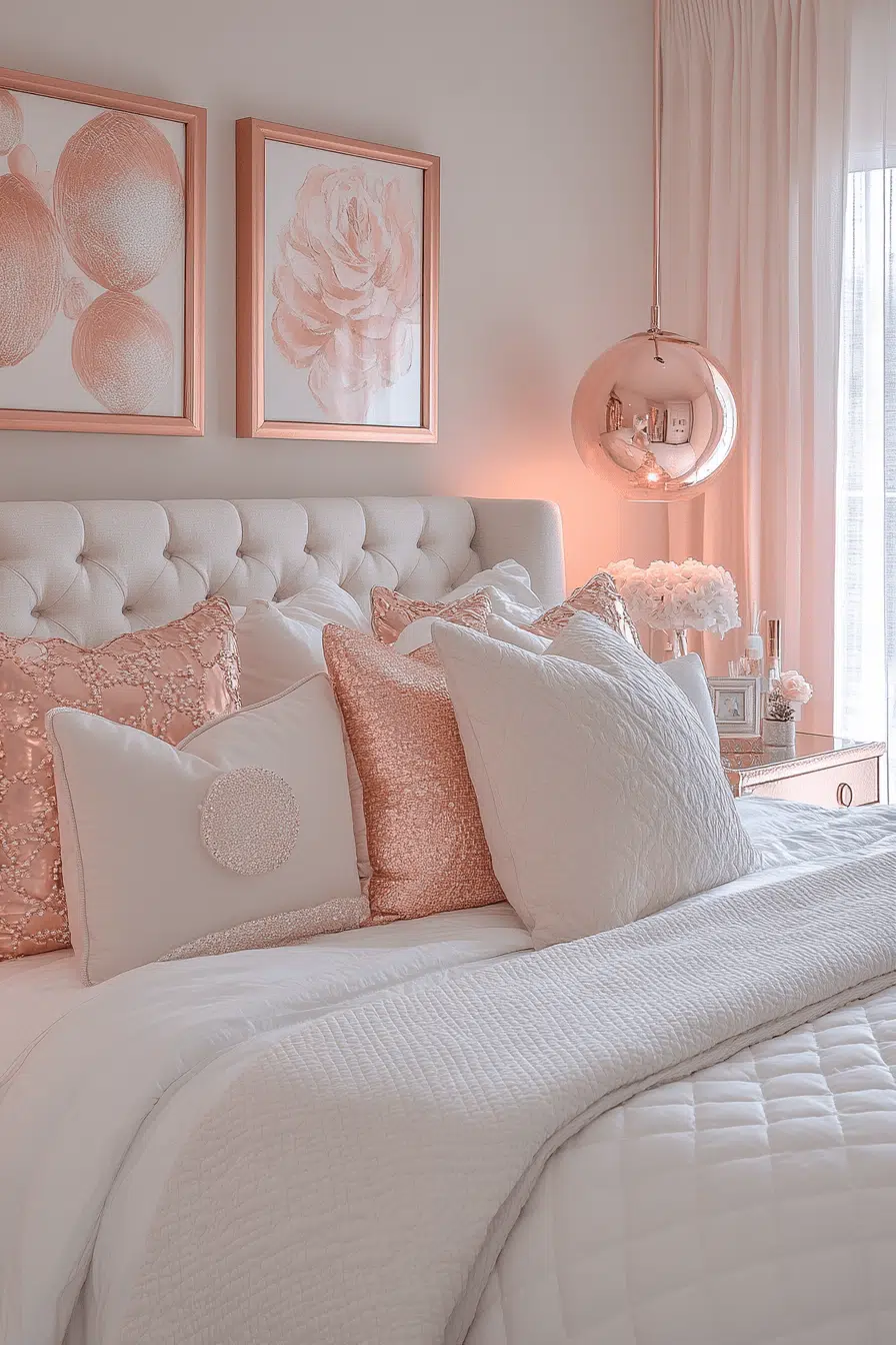 Warm rose gold accents can elevate girlie room decor with a soft, elegant glow. Decorative pieces in this tone pair beautifully with blush and neutral palettes. Subtle sparkle adds visual interest without overpowering the design. The space feels polished yet cozy. It’s a perfect balance of warmth and style. Discover more girlie room decor ideas with metallic accents.