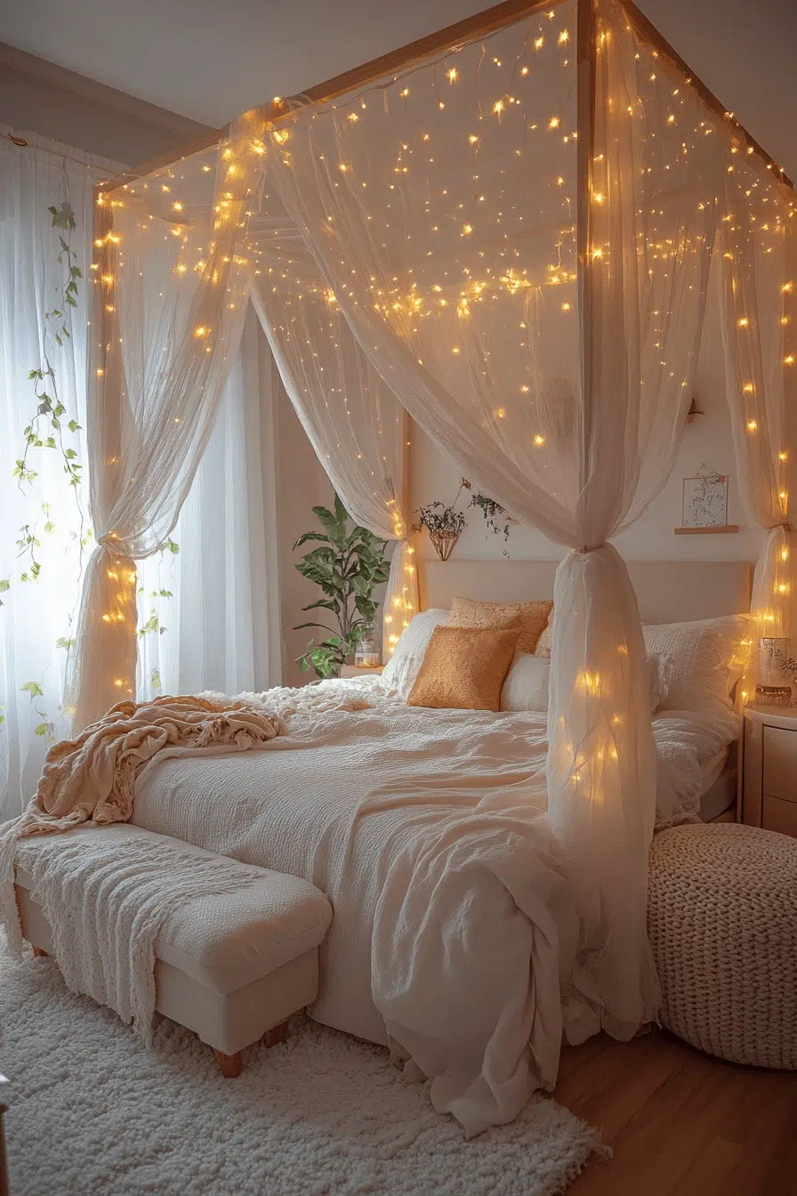A canopy bed can instantly transform girlie room decor into a romantic and dreamy retreat. Sheer drapes create a soft, elegant frame around the bed. Twinkling lights add a warm glow that enhances the ambiance. Layered bedding adds comfort and texture. The space feels whimsical and inviting. Explore more girlie room decor ideas with cozy elegance.