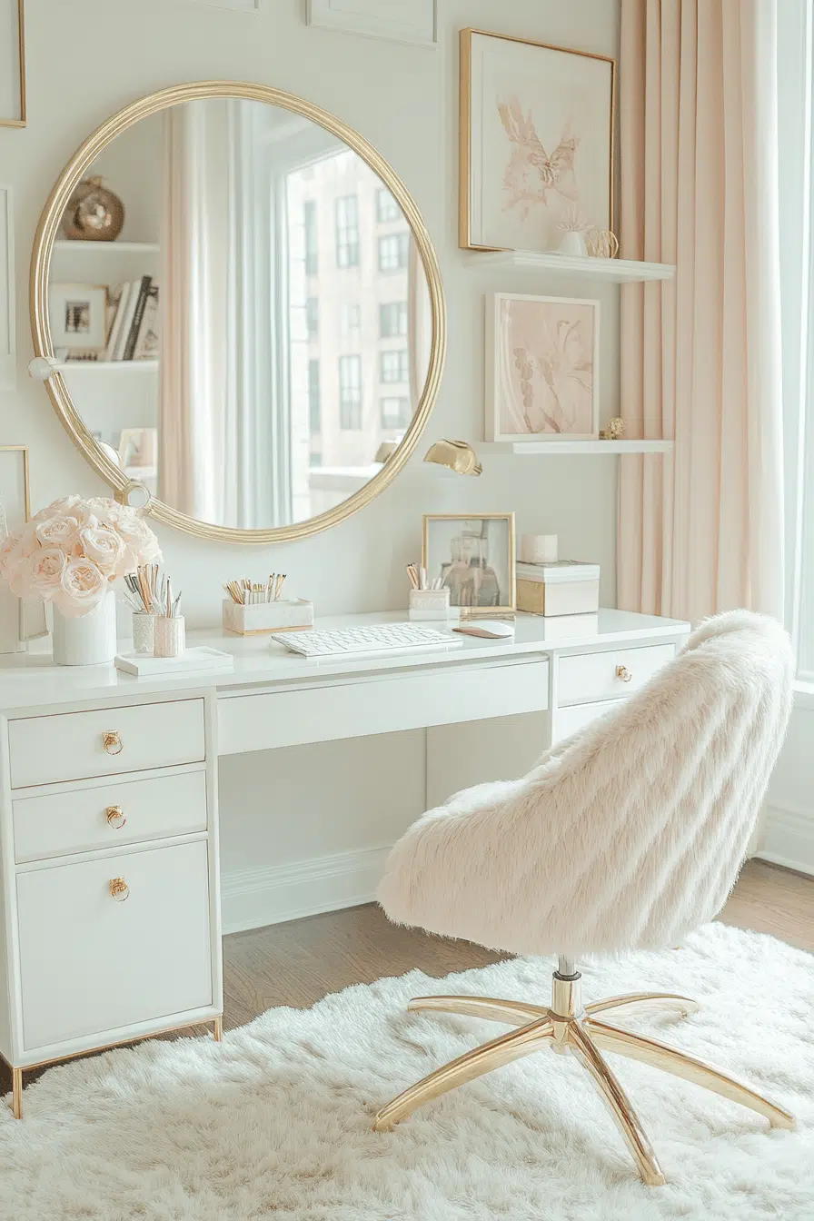 A chic workspace can enhance girlie room decor by combining style and practicality. A sleek desk with soft tones and metallic accents creates a polished look. Organized storage keeps everything neat while adding visual appeal. Comfortable seating completes the setup. The space feels inspiring and functional. Discover more girlie room decor ideas for stylish productivity.