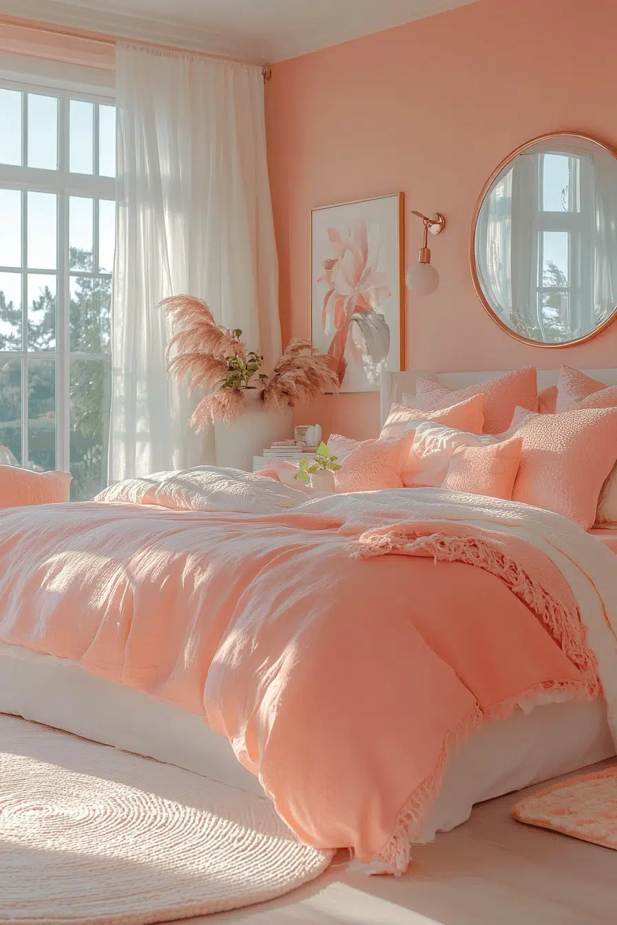 Peach tones can brighten girlie room decor with a warm and cheerful atmosphere. Soft peach bedding paired with neutral walls creates a welcoming vibe. Subtle accents add personality without overpowering the space. The overall look feels uplifting and lively. It’s perfect for creating a positive environment. Discover more girlie room decor ideas with warm tones.