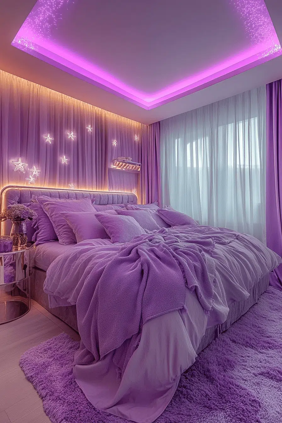 Lavender hues paired with soft lighting can create a dreamy atmosphere in girlie room decor. Lilac tones combined with gentle LED glows bring a calming and modern aesthetic. White furniture and subtle metallic accents add balance without overwhelming the design. Layered lighting enhances the relaxing mood throughout the room. The space feels peaceful and effortlessly chic. Explore more girlie room decor ideas with soothing color palettes.