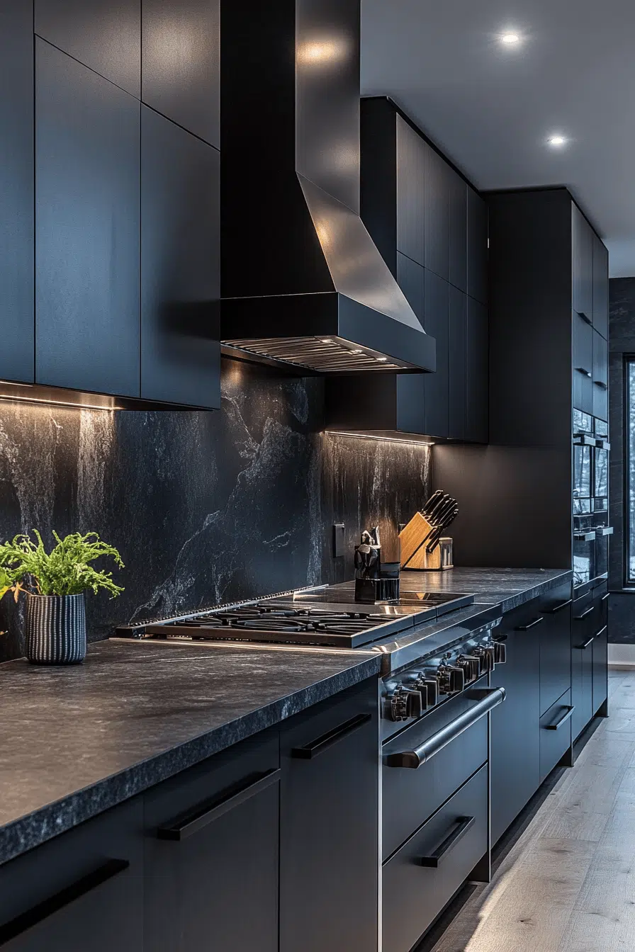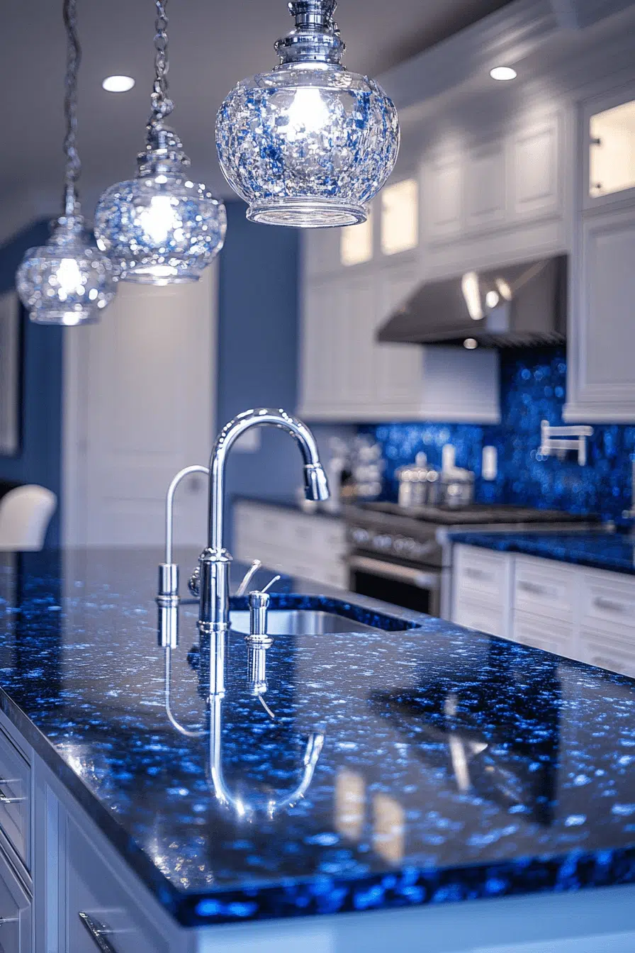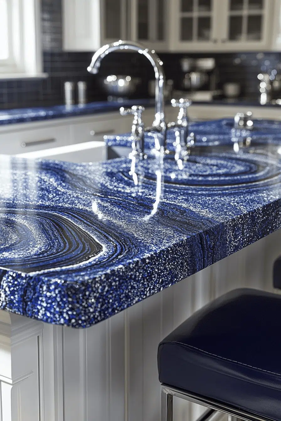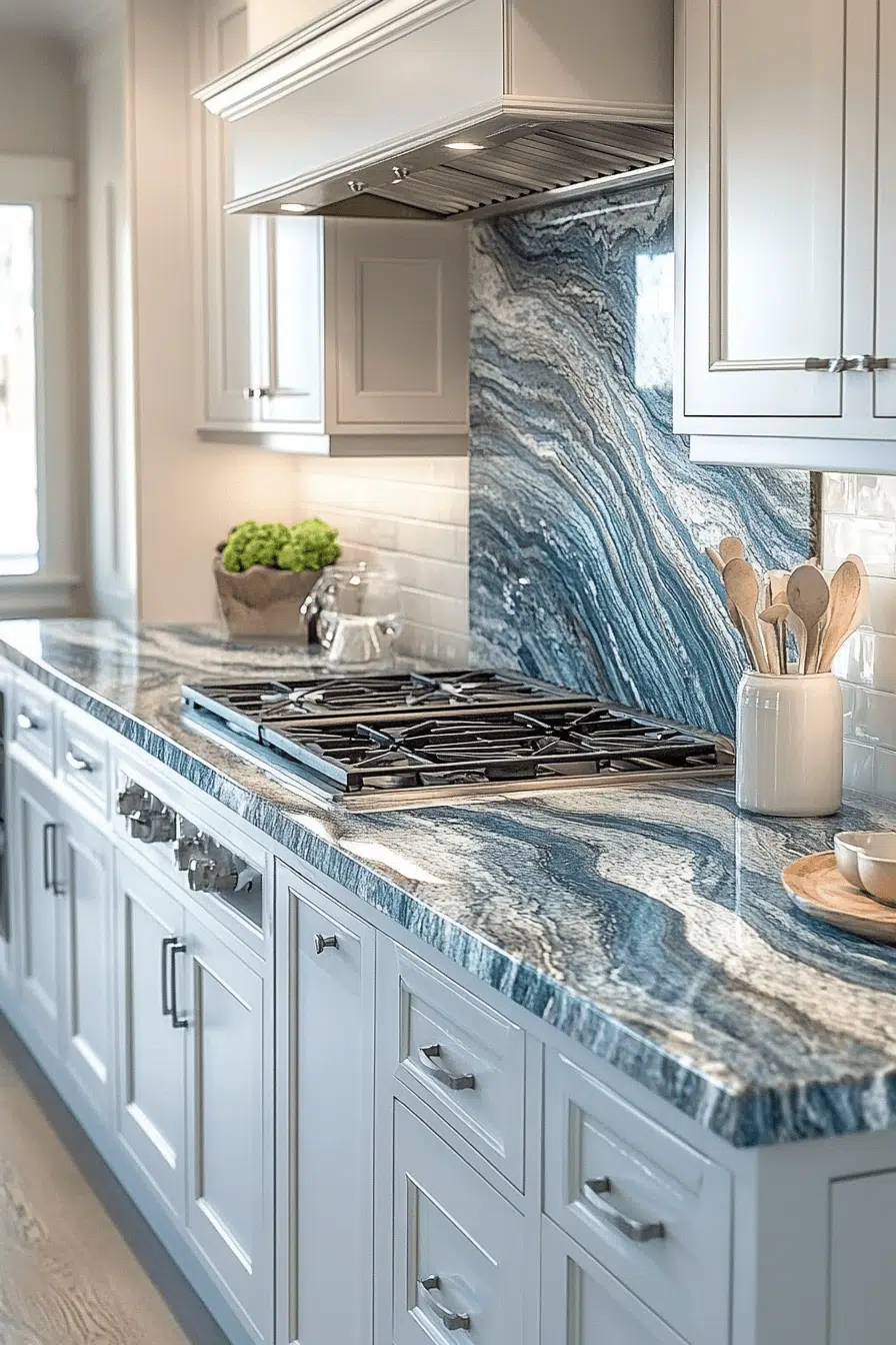 Layered navy tones with lighter accents turn granite countertops into bold and elegant centerpieces. The depth of color creates a dramatic yet refined look. Paired with lighter finishes, the contrast feels balanced. Granite’s durability ensures practicality alongside beauty. The space feels rich and sophisticated. Take a look at more granite countertops with bold color contrast.