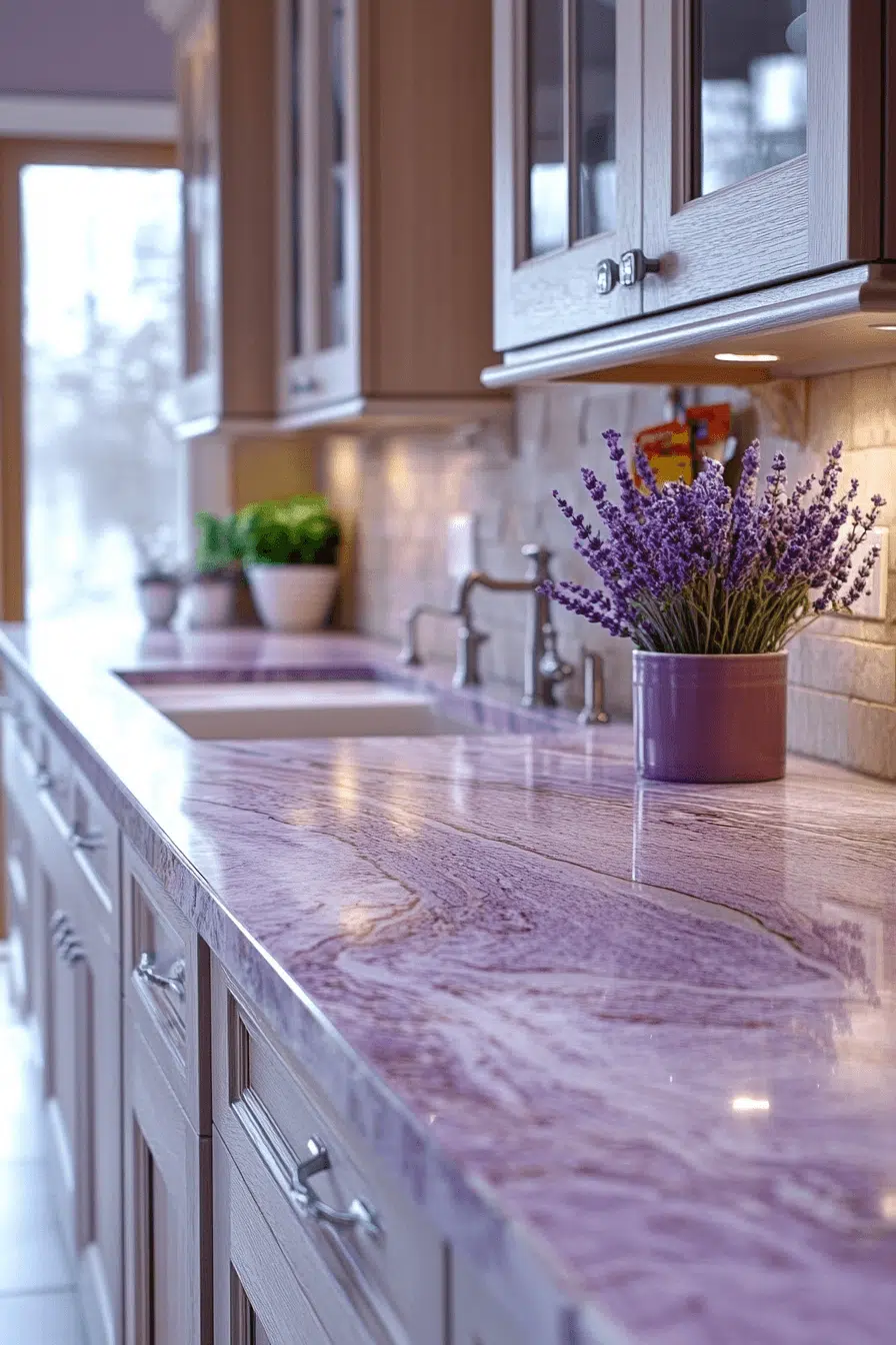 Muted lilac shades with intricate detailing create granite countertops that feel distinctive yet understated. The gentle color adds visual interest without dominating the space. This palette works well with a wide range of interior styles. Granite’s strength ensures it performs well in high-use areas. The look feels elegant and quietly unique. Discover more granite countertops with subtle individuality.