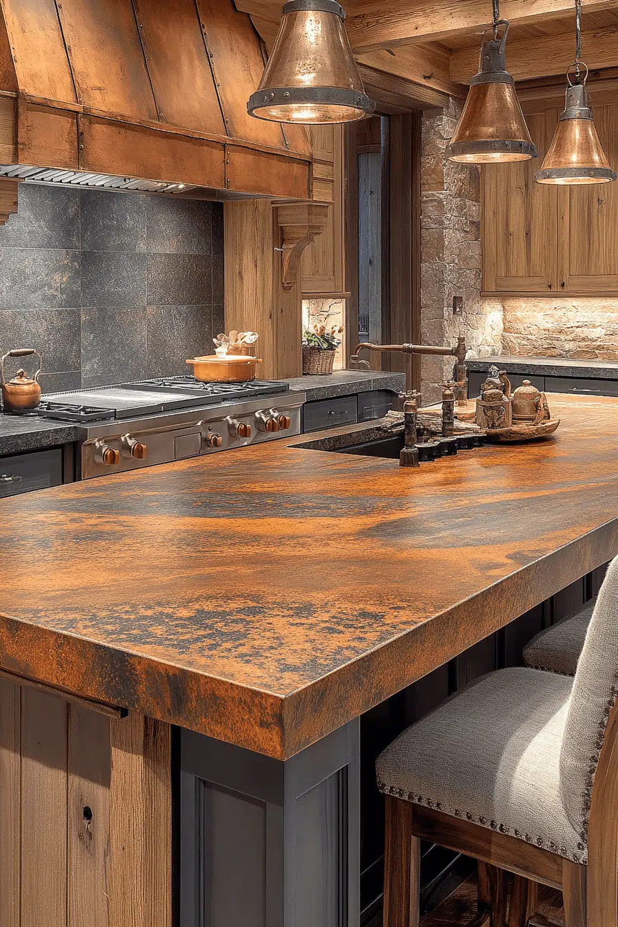 Copper-inspired tones blended with earthy undertones create granite countertops that feel bold and full of character. The warm palette adds depth while maintaining versatility. This style works across both modern and classic interiors. Granite’s durability ensures it withstands daily use. The overall look feels distinctive and grounded. Discover more granite countertops with unique color blends.
