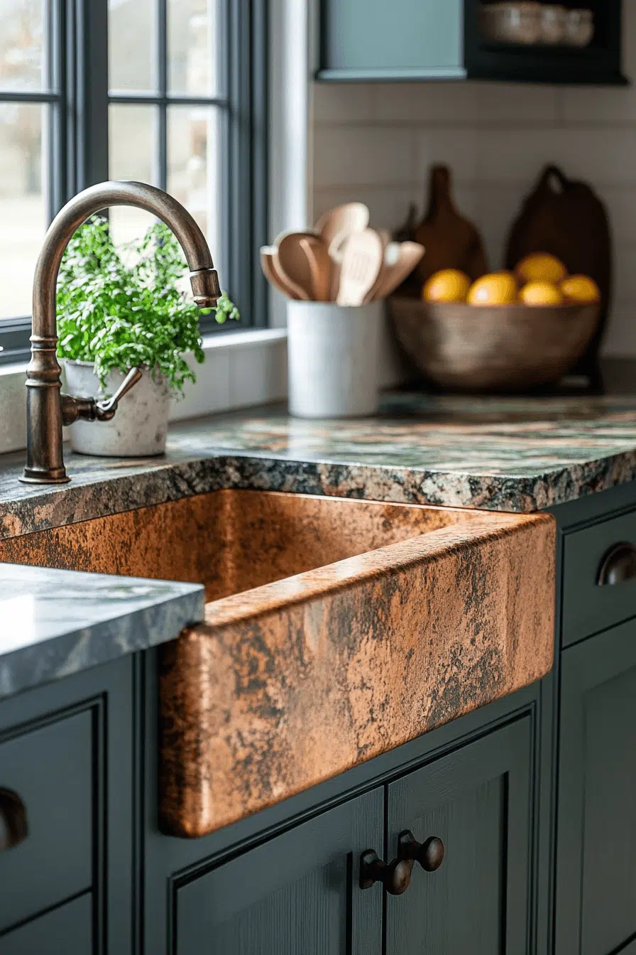 Deep bronze shades with striking veining give granite countertops a dramatic and high-end appearance. The combination of tones adds richness and visual depth. This design pairs beautifully with darker finishes for a cohesive look. Granite’s durability ensures it remains a long-term investment. The result feels strong and elegant. Browse more granite countertops with bold sophistication.