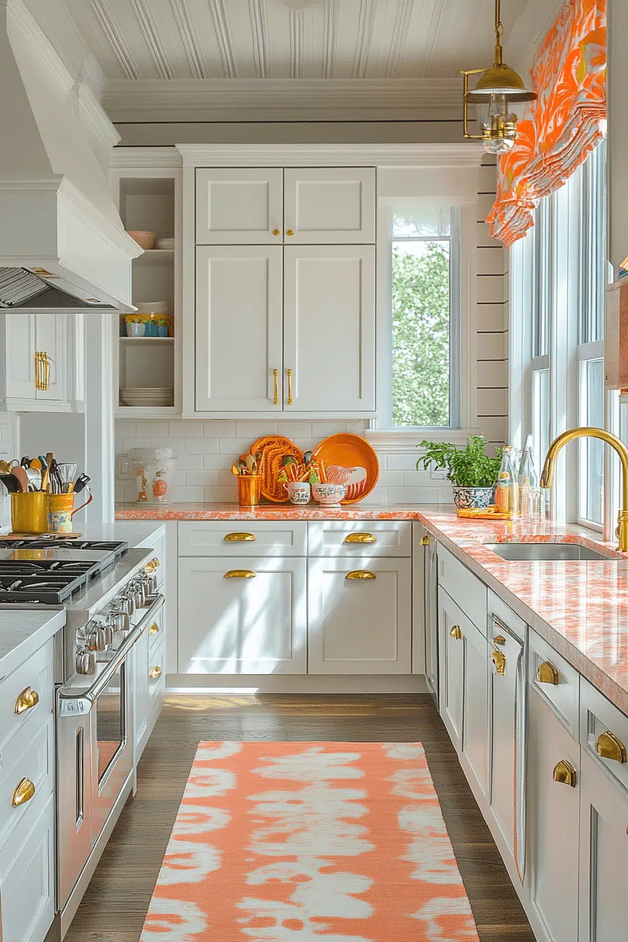 Bright coral-inspired tones with streaks of white and gold give granite countertops a lively and energetic feel. The bold color creates a standout feature while still maintaining balance. This design works well in both modern and traditional settings. Granite’s durability ensures everyday practicality. The result feels vibrant and full of personality. Discover more granite countertops with bold color energy.
