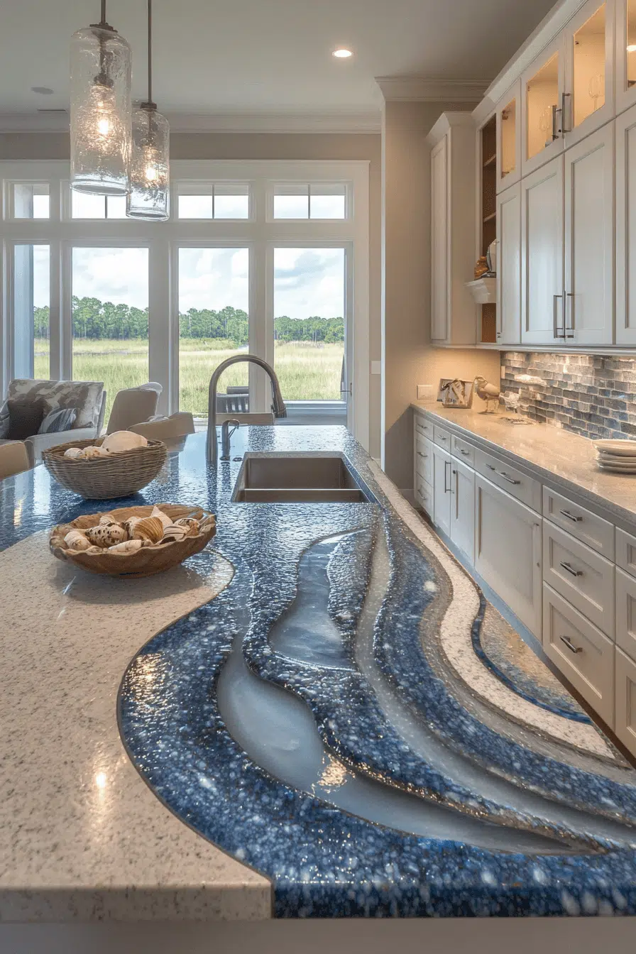 Flowing patterns inspired by natural landscapes give granite countertops a sense of movement and depth. Hints of blue, green, and white create a calming, organic aesthetic. This design works beautifully as a focal point. Granite’s durability ensures lasting performance. The result feels fresh and serene. Browse more granite countertops with natural inspiration.