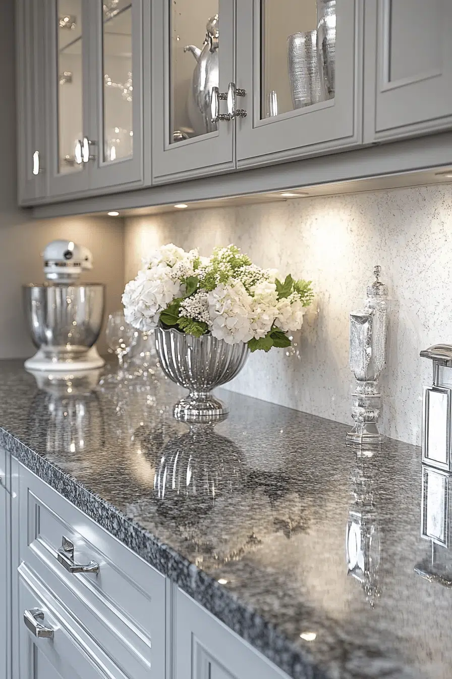A soft silvery base with gentle white accents gives granite countertops a subtle sheen that enhances natural light. This understated glow helps make spaces feel brighter without overpowering the design. It complements both bold and neutral cabinetry styles with ease. Granite’s long-lasting durability makes it a practical yet stylish option. The overall feel is sleek and adaptable. See more granite countertops with refined, luminous finishes.