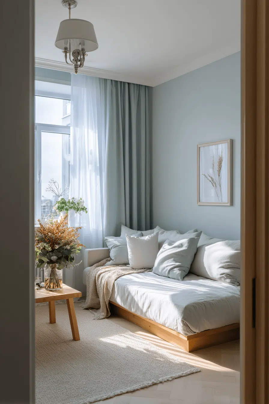 Gentle lighting enhances a japandi small bedroom with a warm, calming glow. Light tones reflect brightness beautifully. The atmosphere feels open and inviting. Every detail contributes to relaxation. The space feels peaceful throughout the day. Light up your japandi small bedroom with warmth!