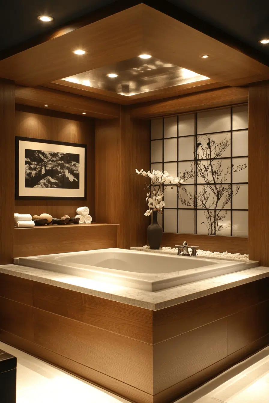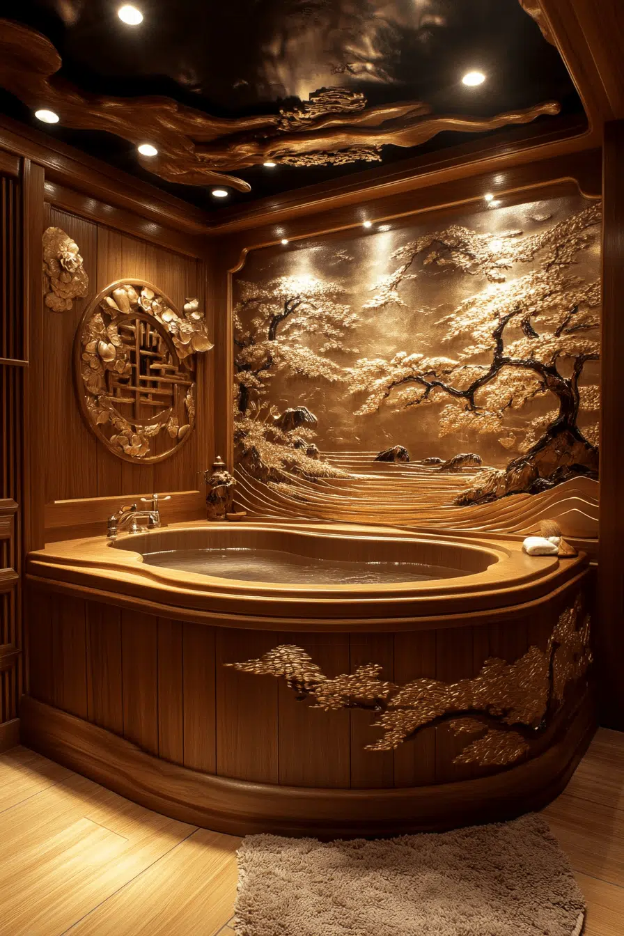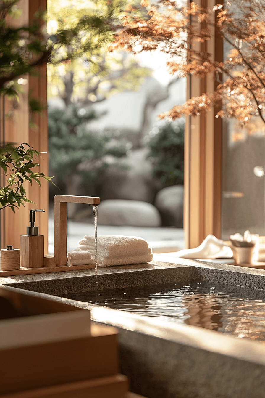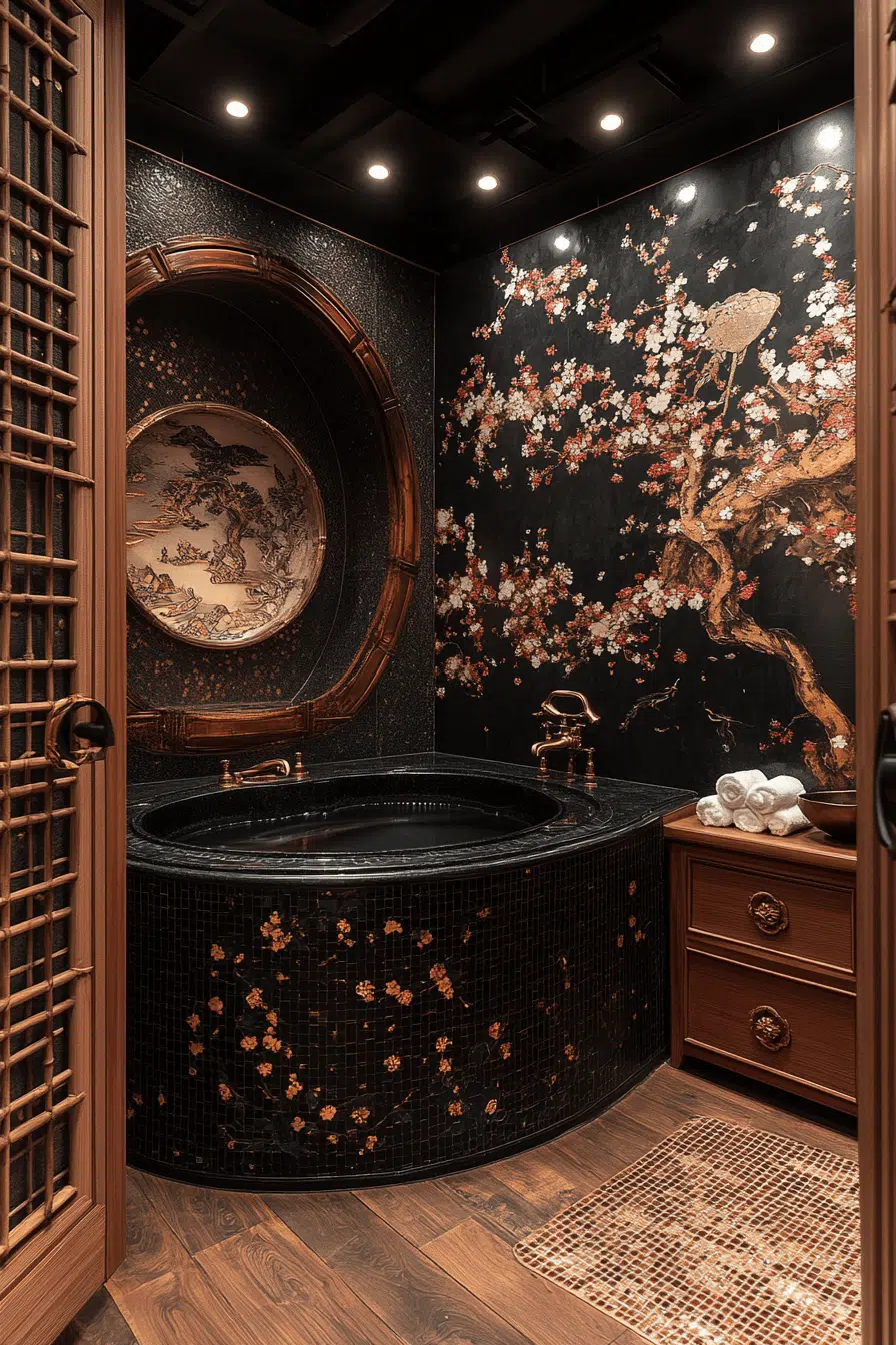Elegant detail elevates a japanese bathroom with refined finishes and rich textures inspired by traditional artistry. Soft fabrics and subtle metallic accents create depth. Wooden features enhance the overall look. Lighting highlights every detail beautifully. The space feels luxurious yet calming. Balance defines the design. Discover elegant japanese bathroom styling today!