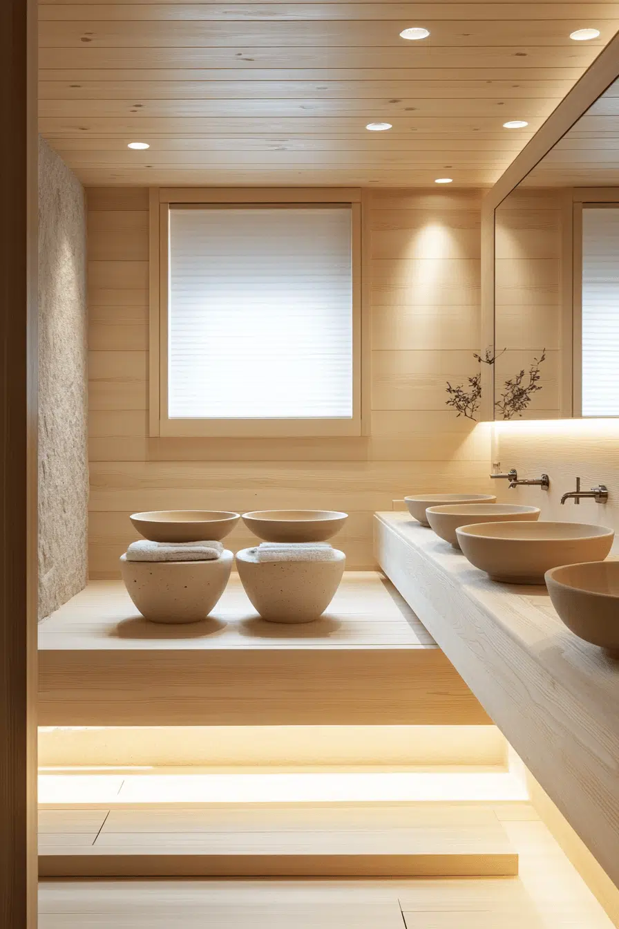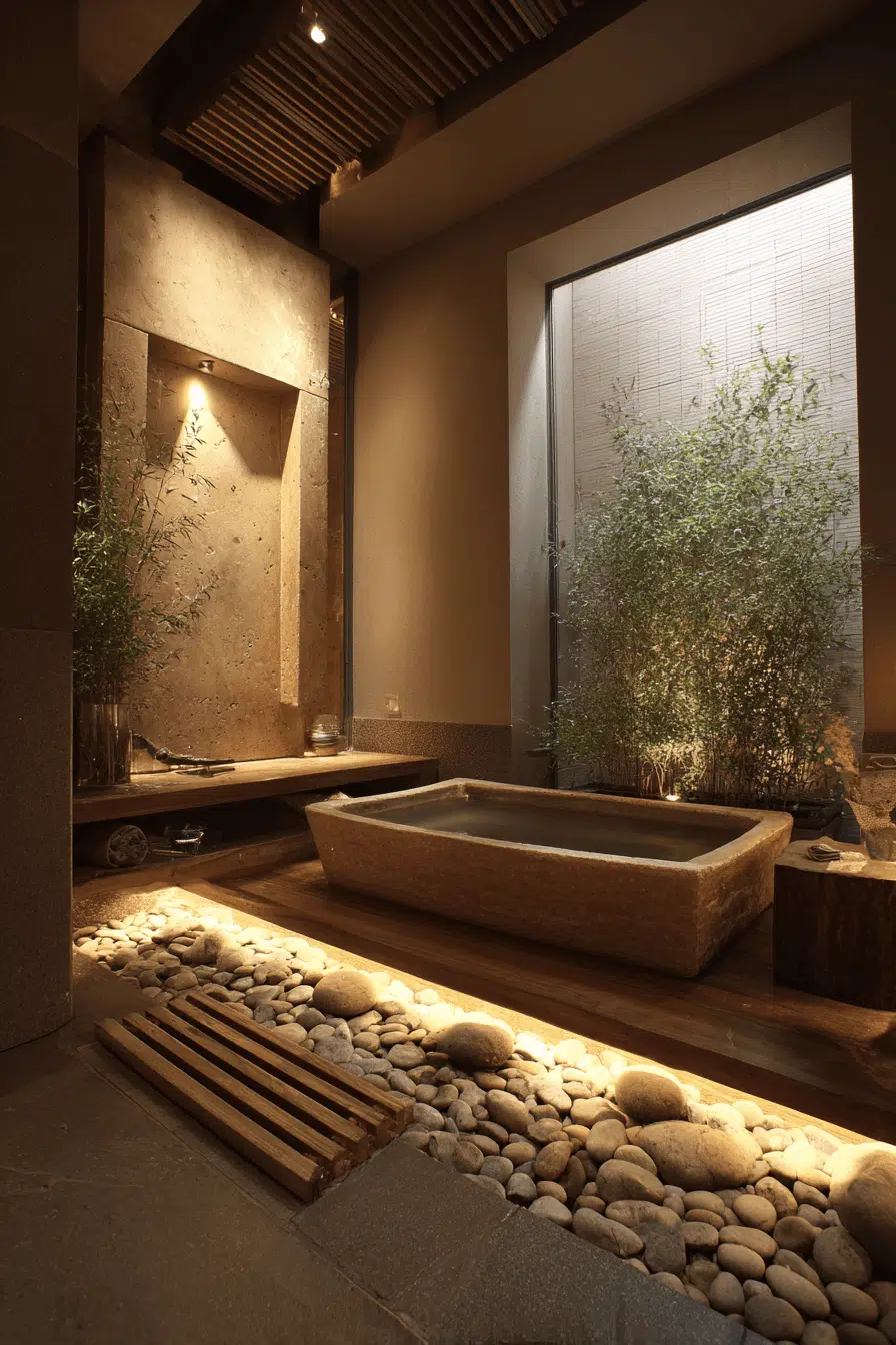 Warm ambient glow enhances a japanese bathroom through lighting that feels cozy and welcoming. Lantern-style fixtures create a soft atmosphere. Natural textures become more pronounced under warm light. The design feels balanced and inviting. Subtle details add depth and charm. The overall space feels relaxing and refined. Discover warm lighting japanese bathroom ideas now!