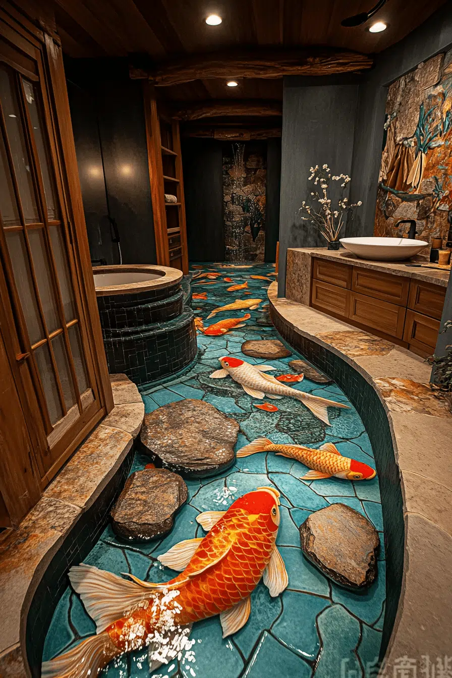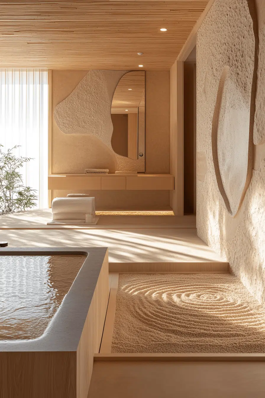 Flowing water inspiration brings a japanese bathroom to life with artistic details that mimic movement and calm. Subtle patterns and textures create a serene visual effect. Natural stone elements enhance the organic design. Soft lighting adds warmth and depth. Every detail contributes to a peaceful environment. The space feels like a quiet escape. Discover creative japanese bathroom designs now!