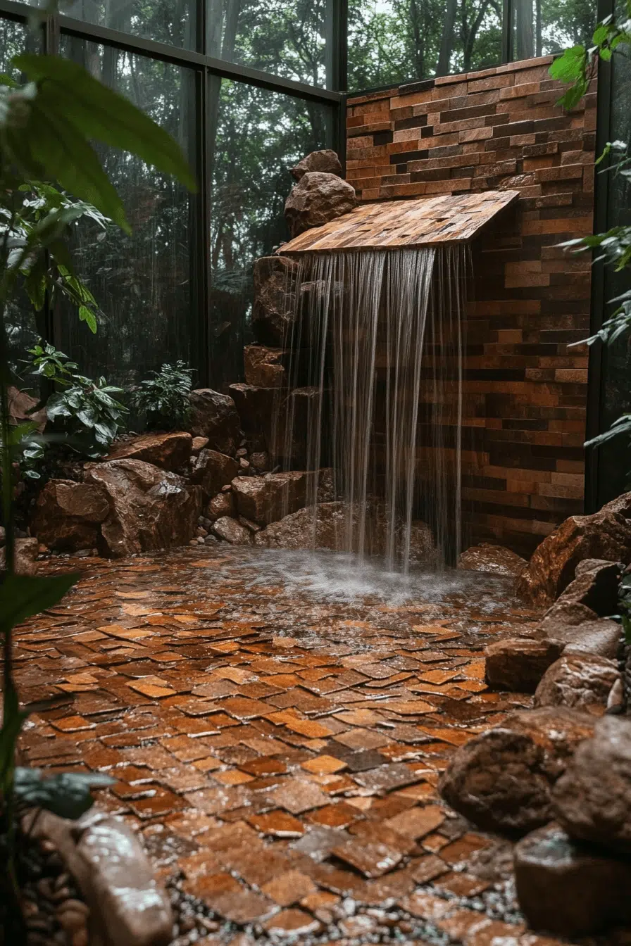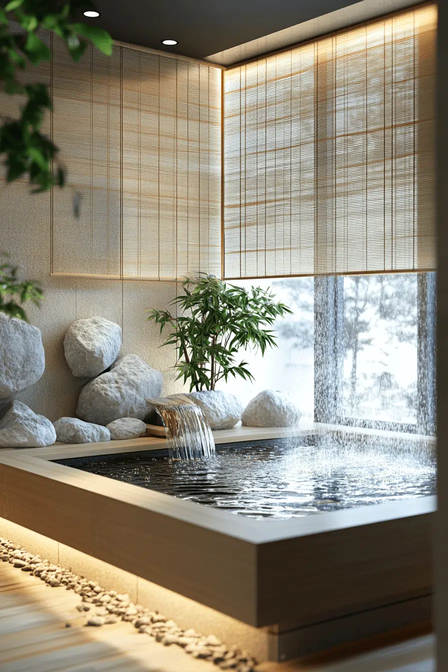 Flowing water features enhance a japanese bathroom with movement and sound that create a peaceful atmosphere. Stone textures add depth and authenticity. Lighting highlights every element beautifully. The design feels immersive and calming. Natural influence shapes the entire space. The result feels like a retreat. Explore water-inspired japanese bathroom ideas today!