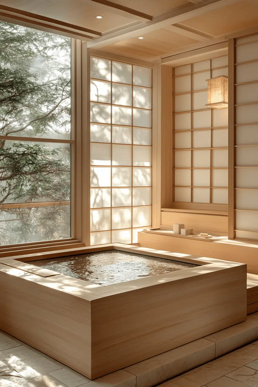 Soft filtered light fills a japanese bathroom with a warm, calming glow created through translucent panels. Natural wood frames enhance the design. Clean styling keeps everything airy and open. Light plays gently across surfaces. The space feels peaceful and elegant. Every detail enhances comfort. Discover soft light japanese bathroom ideas today!