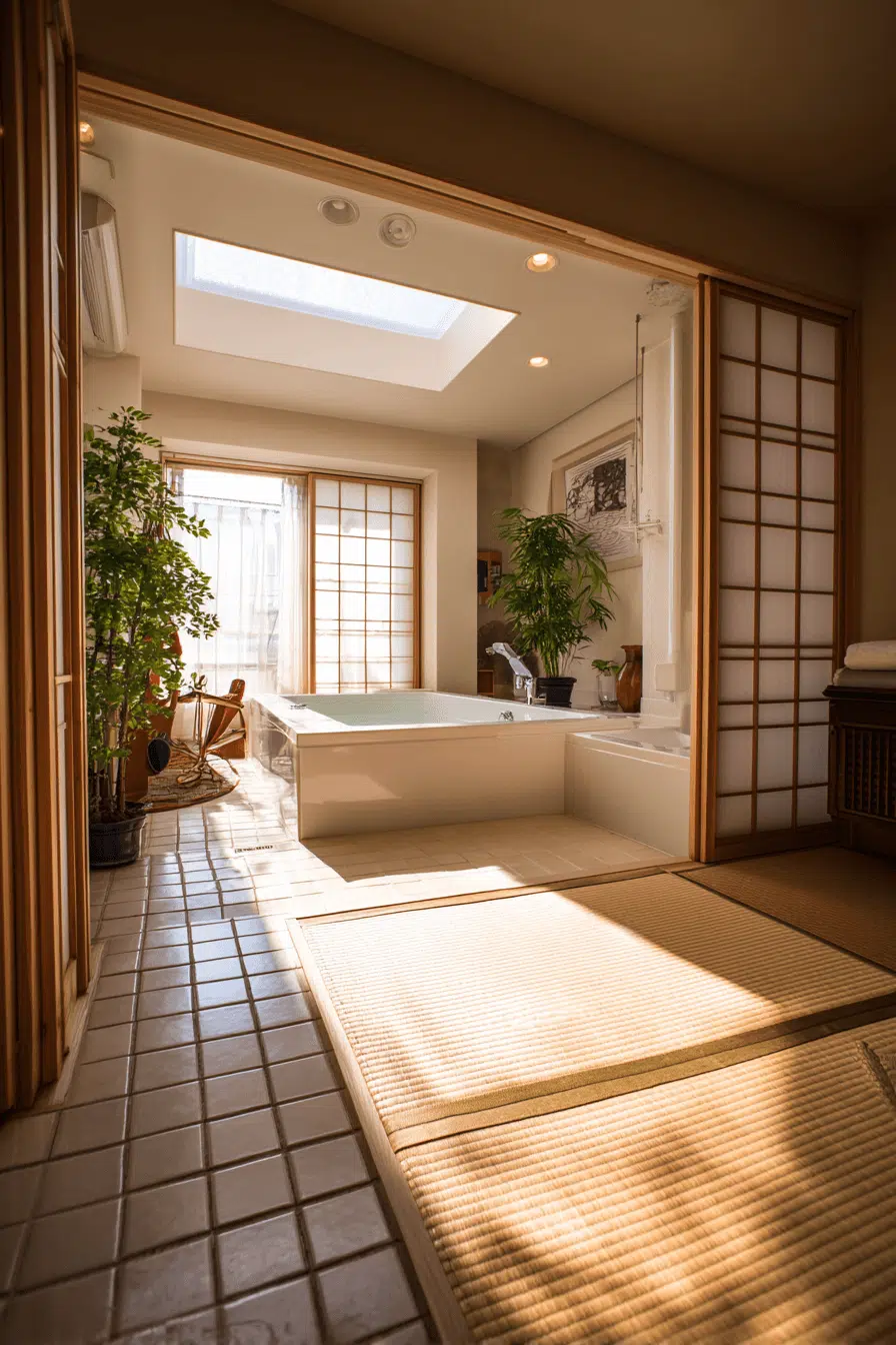 Gentle illumination defines a japanese bathroom where soft lighting creates a calm and elegant ambiance. Filtered light through panels adds depth and warmth. Natural textures remain the focus while light enhances every detail. The atmosphere feels balanced and soothing. Clean design keeps the space uncluttered. The overall mood is tranquil and refined. Experience this softly lit japanese bathroom style today!