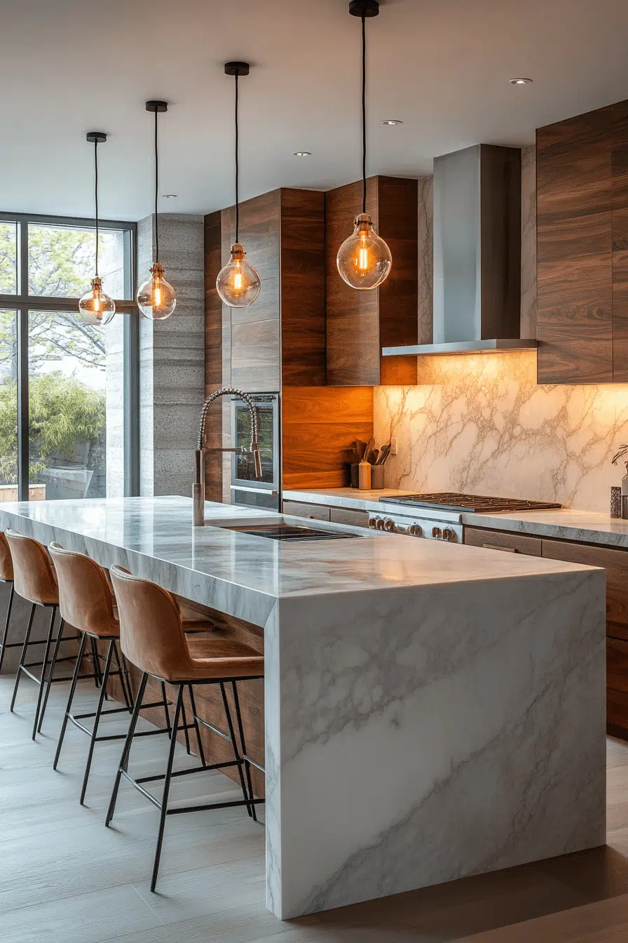 Linear fixtures introduce strong visual structure as statement-focused kitchen lighting ideas. Suspended above islands or counters, they deliver generous task lighting while anchoring the space. Their elongated forms establish architectural balance overhead. Designs range from sleek contemporary to bold industrial. These fixtures naturally draw attention upward. Discover bar lighting ideas that turn functional illumination into a striking design feature!